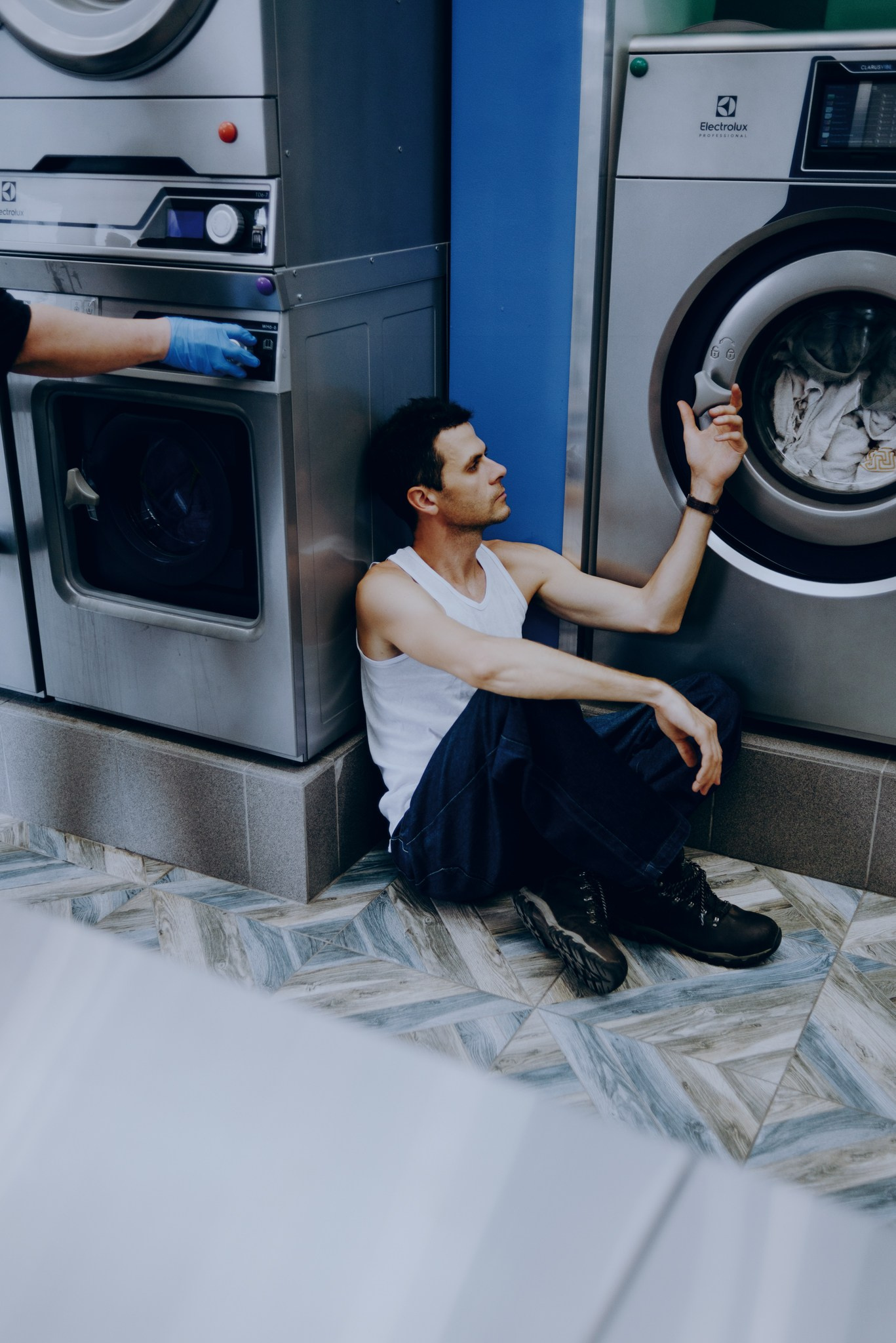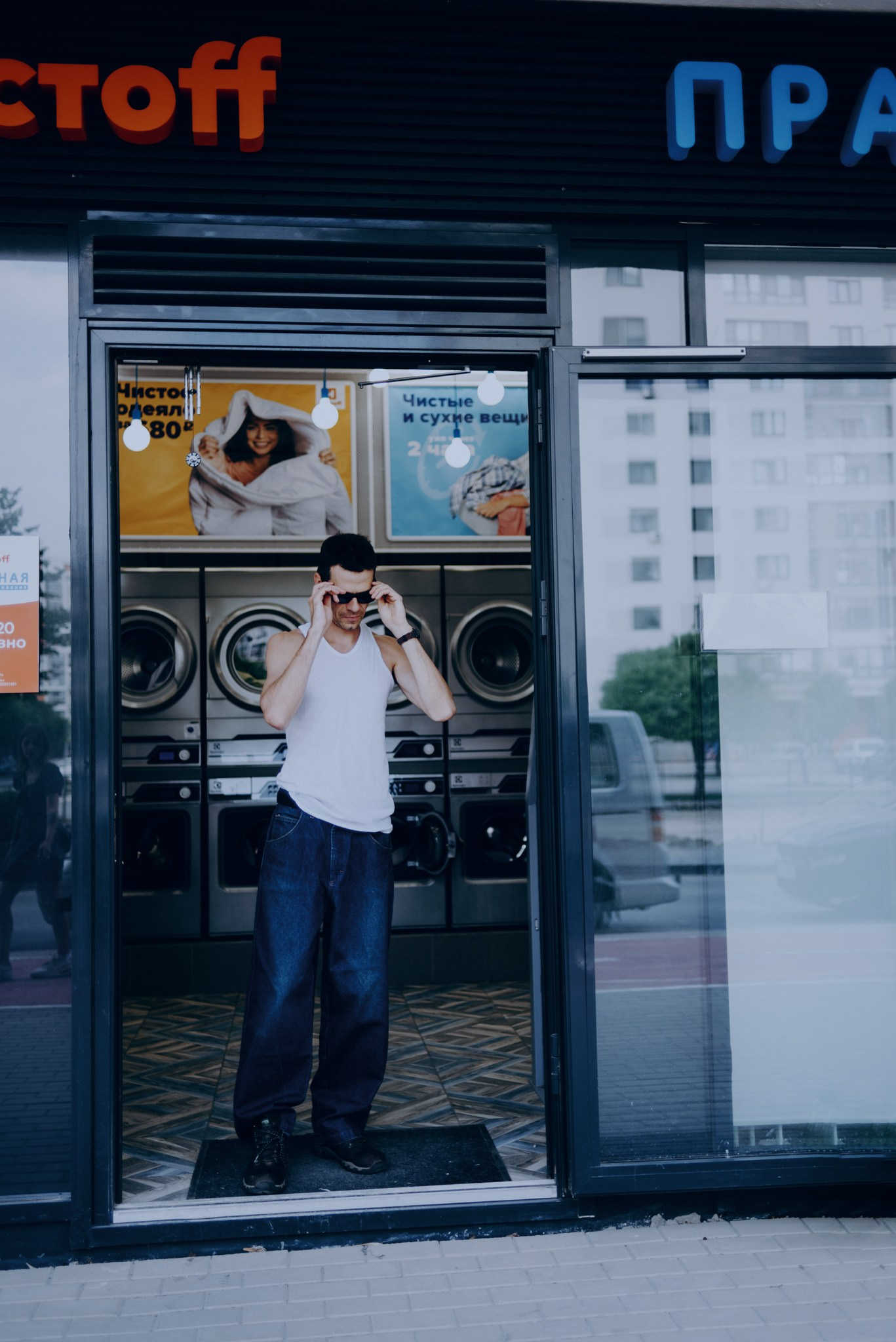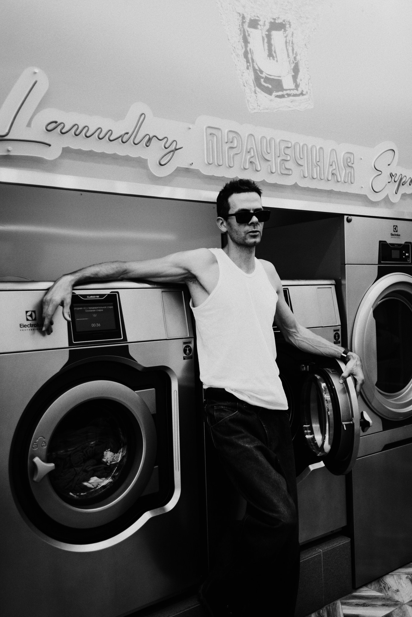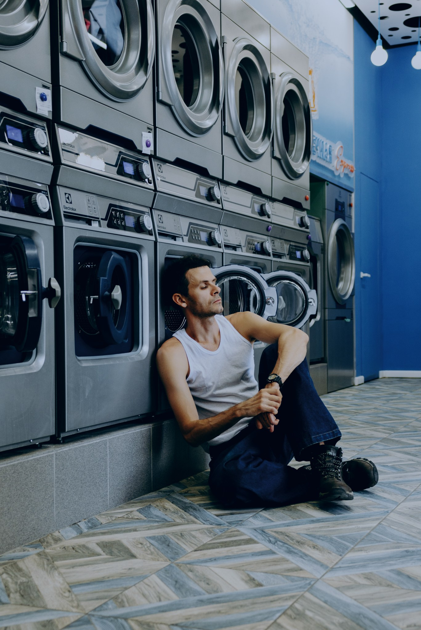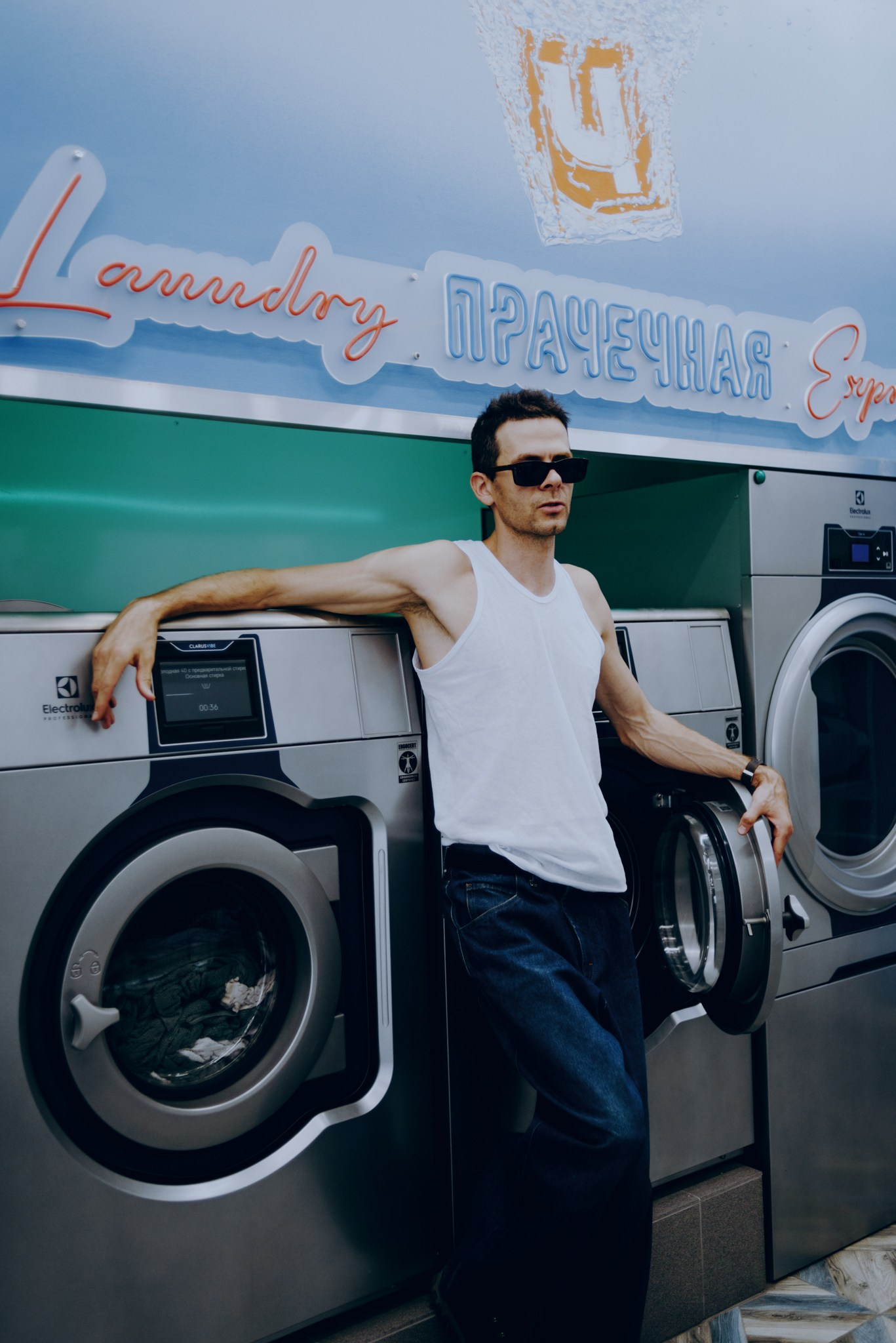 У меня давно была задумка: снять историю о герое фильма, который долго был в пути, прошел через приключения и теперь просто «завис» в придорожной прачечной. Я заранее нашла локацию, согласовала съемку, и всё сложилось идеально.