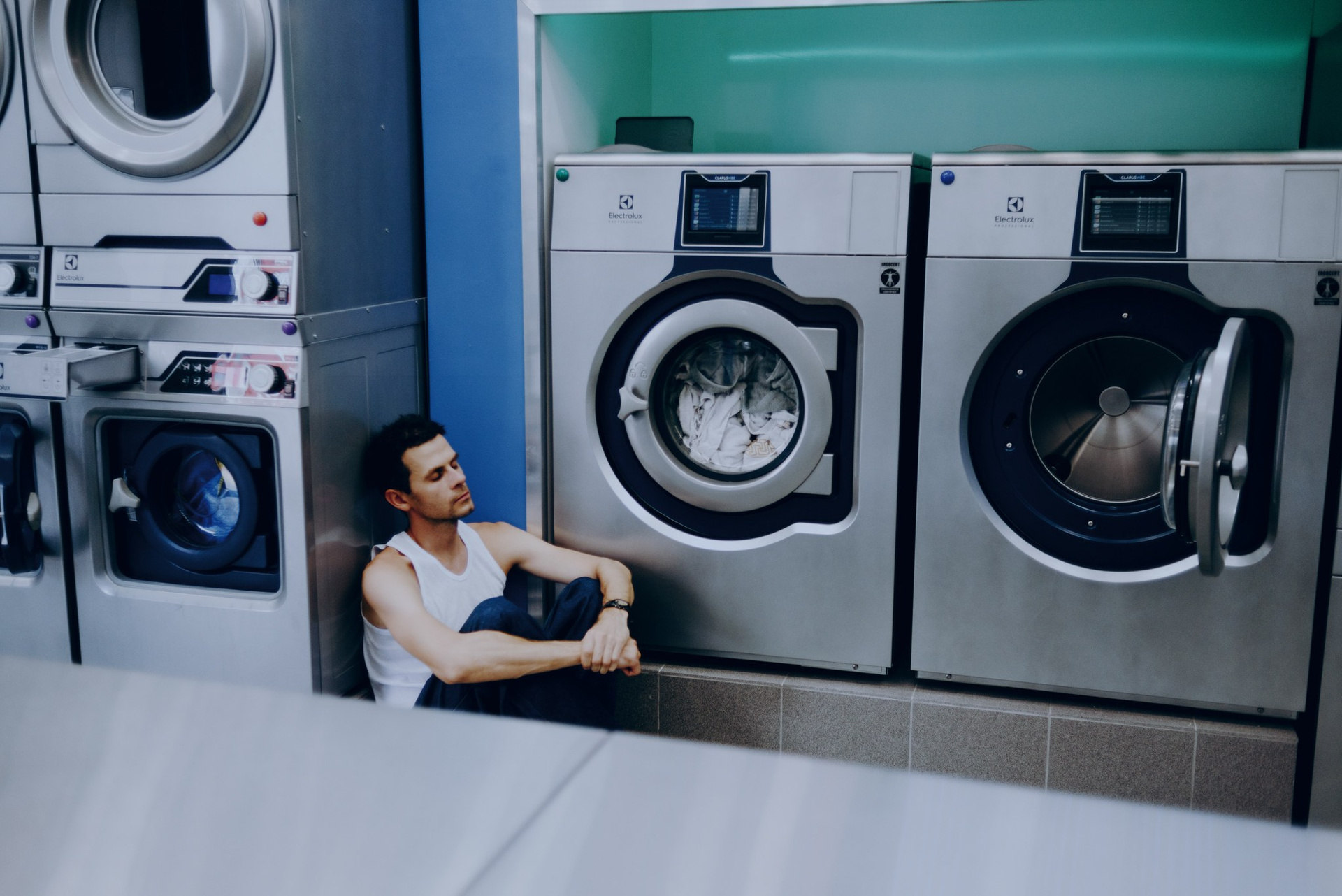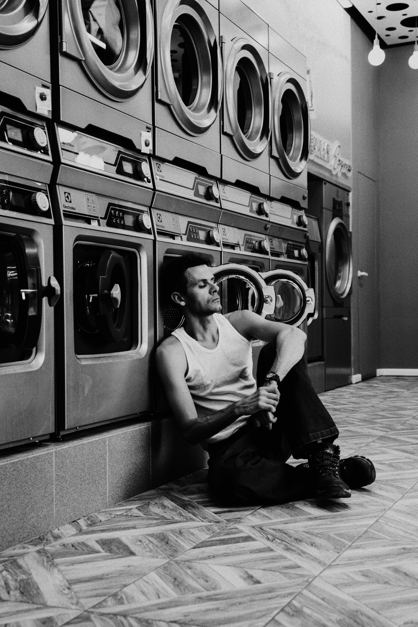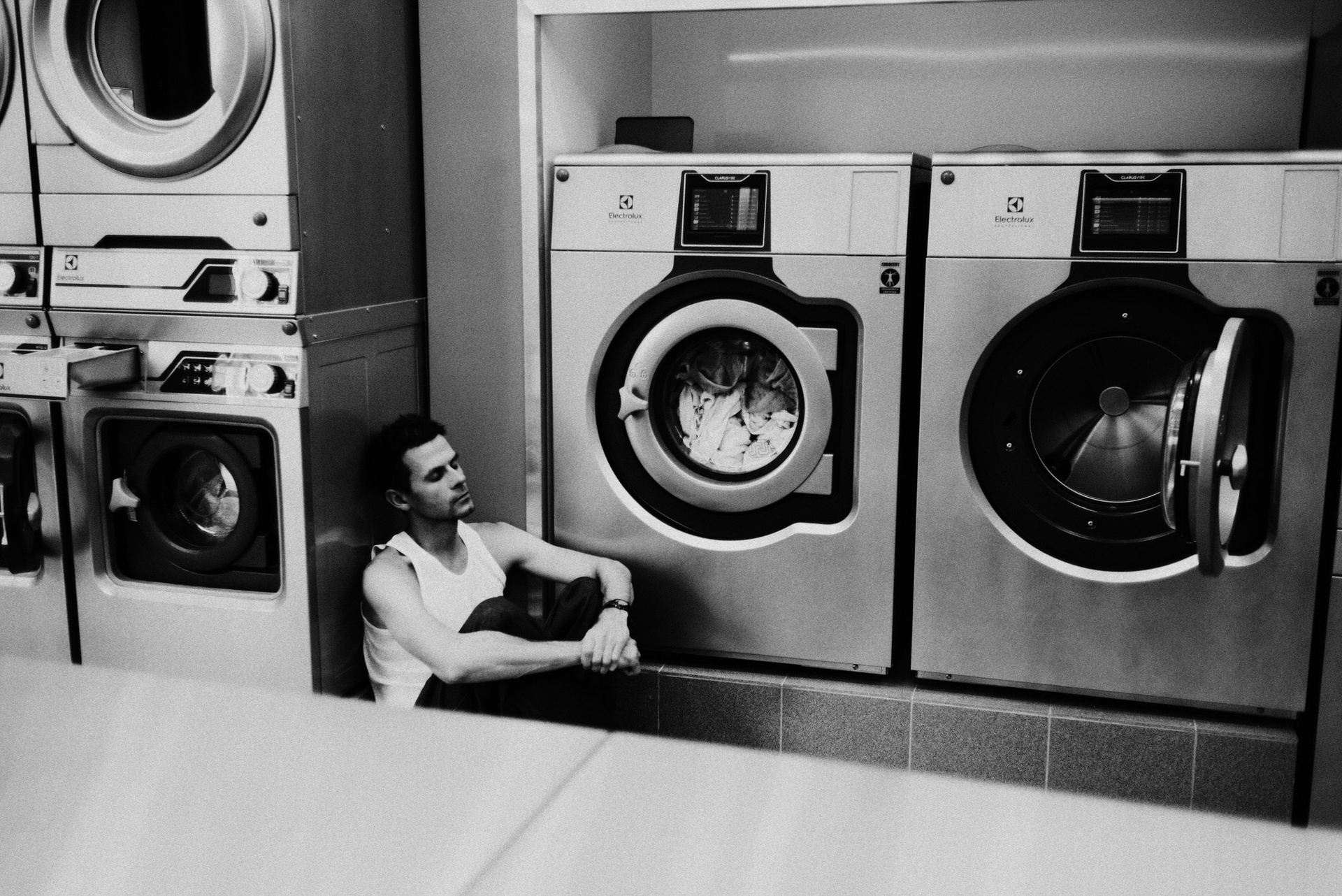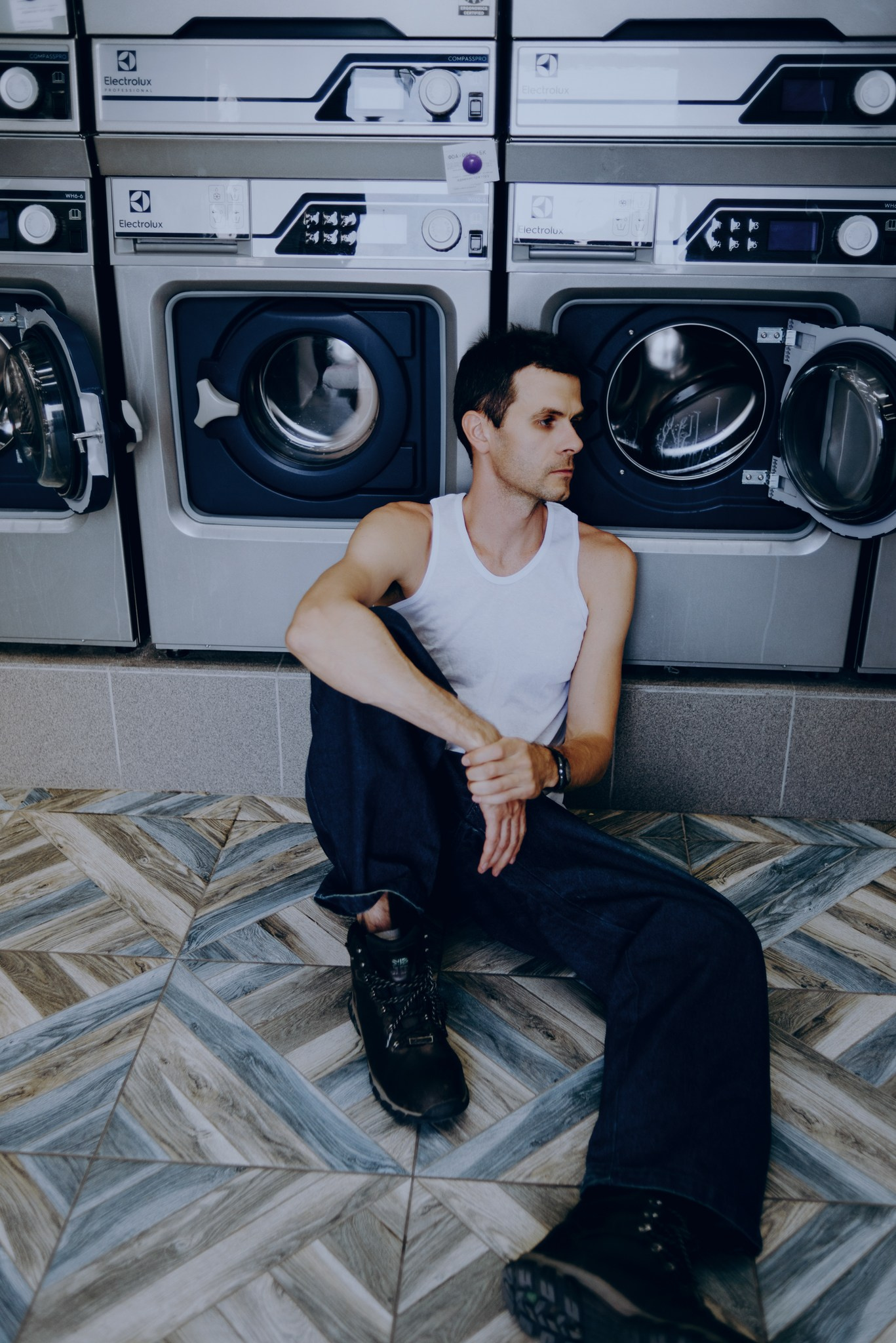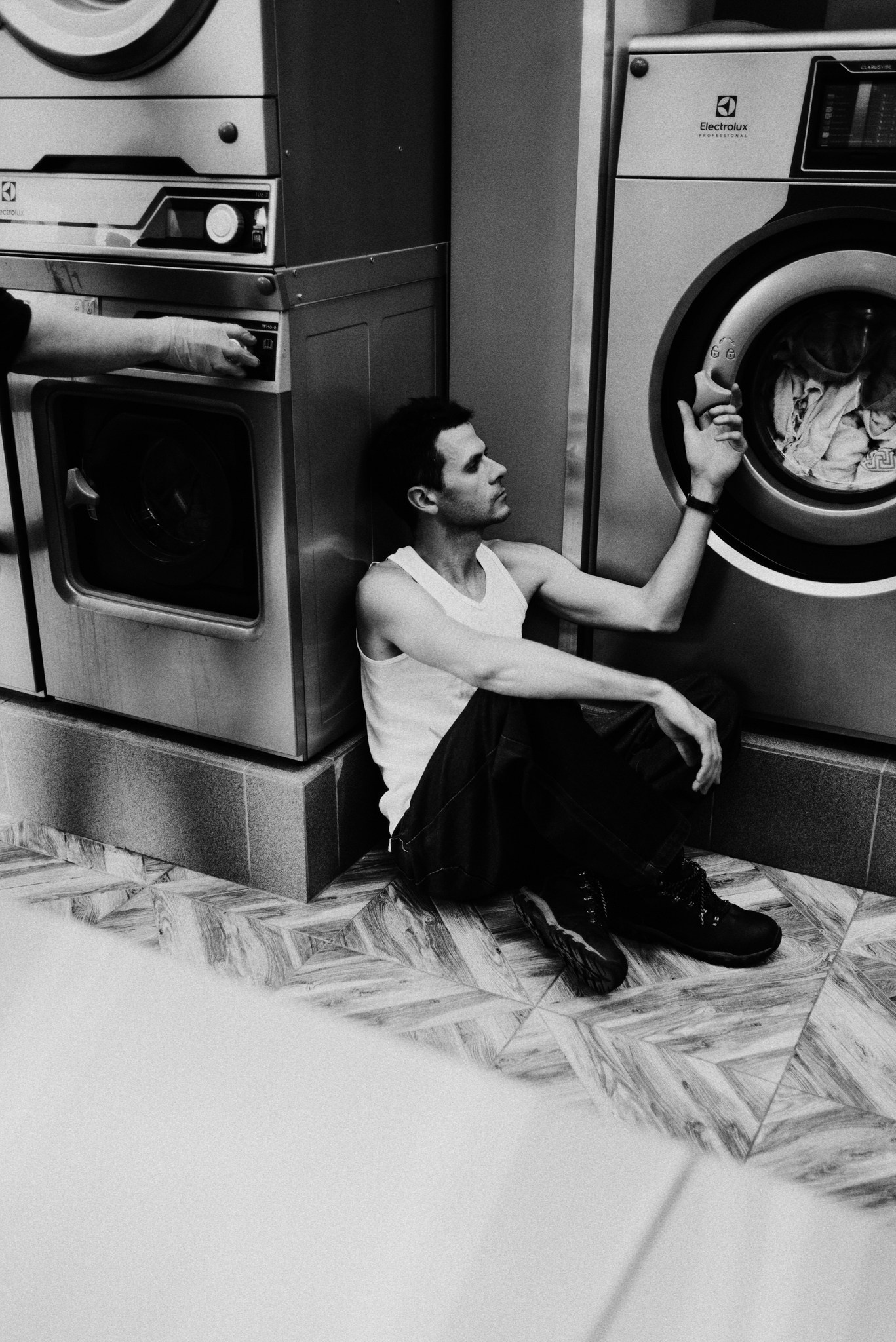 У меня давно была задумка: снять историю о герое фильма, который долго был в пути, прошел через приключения и теперь просто «завис» в придорожной прачечной. Я заранее нашла локацию, согласовала съемку, и всё сложилось идеально.