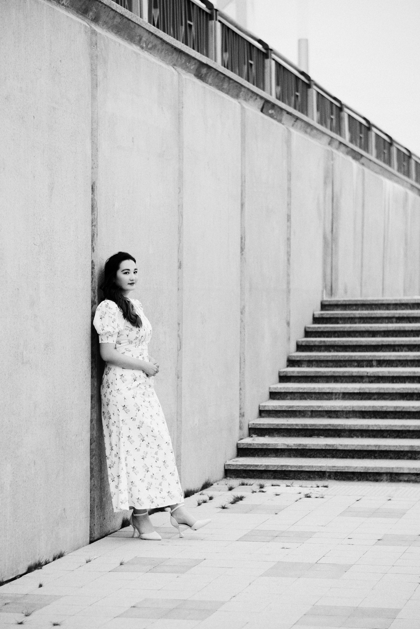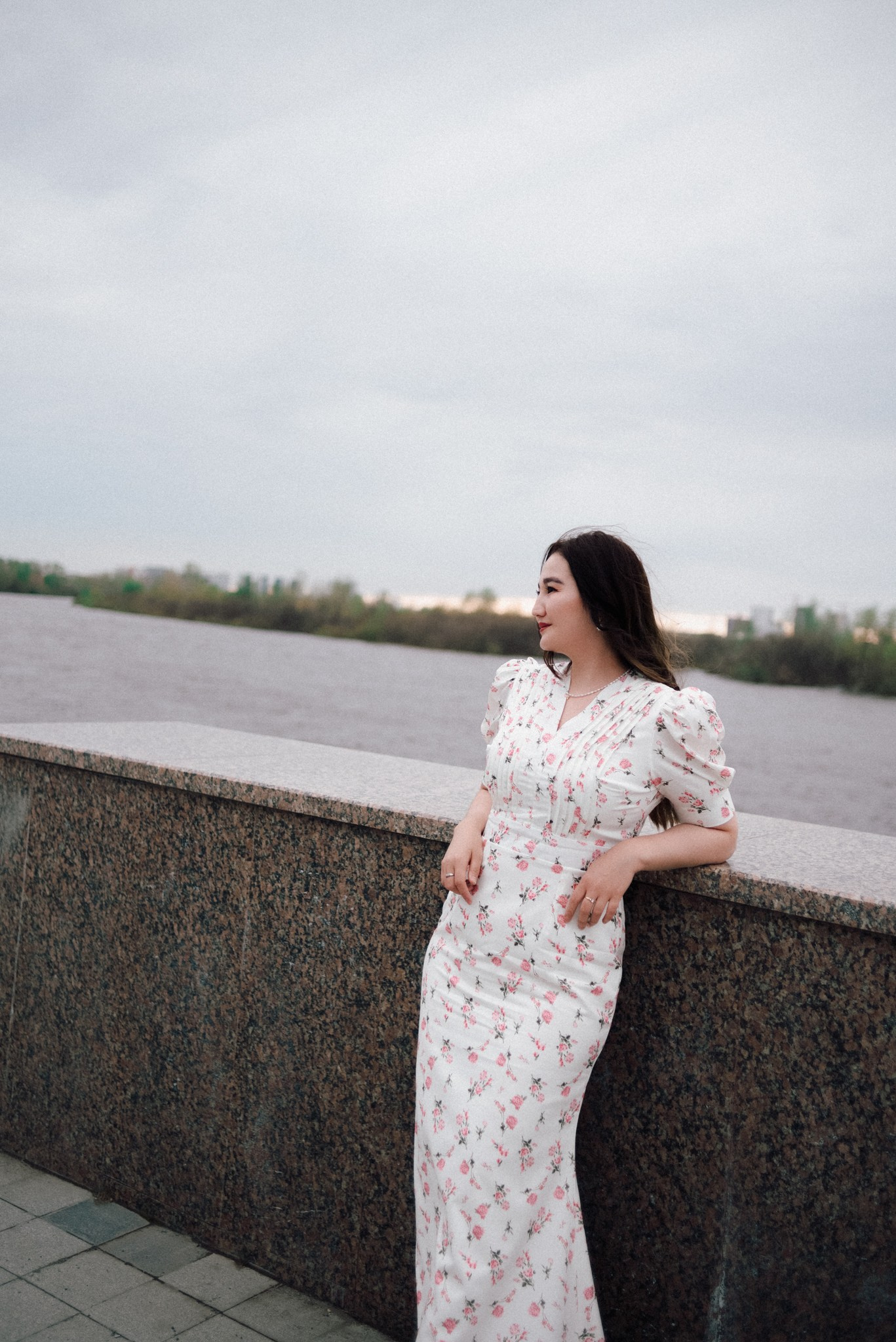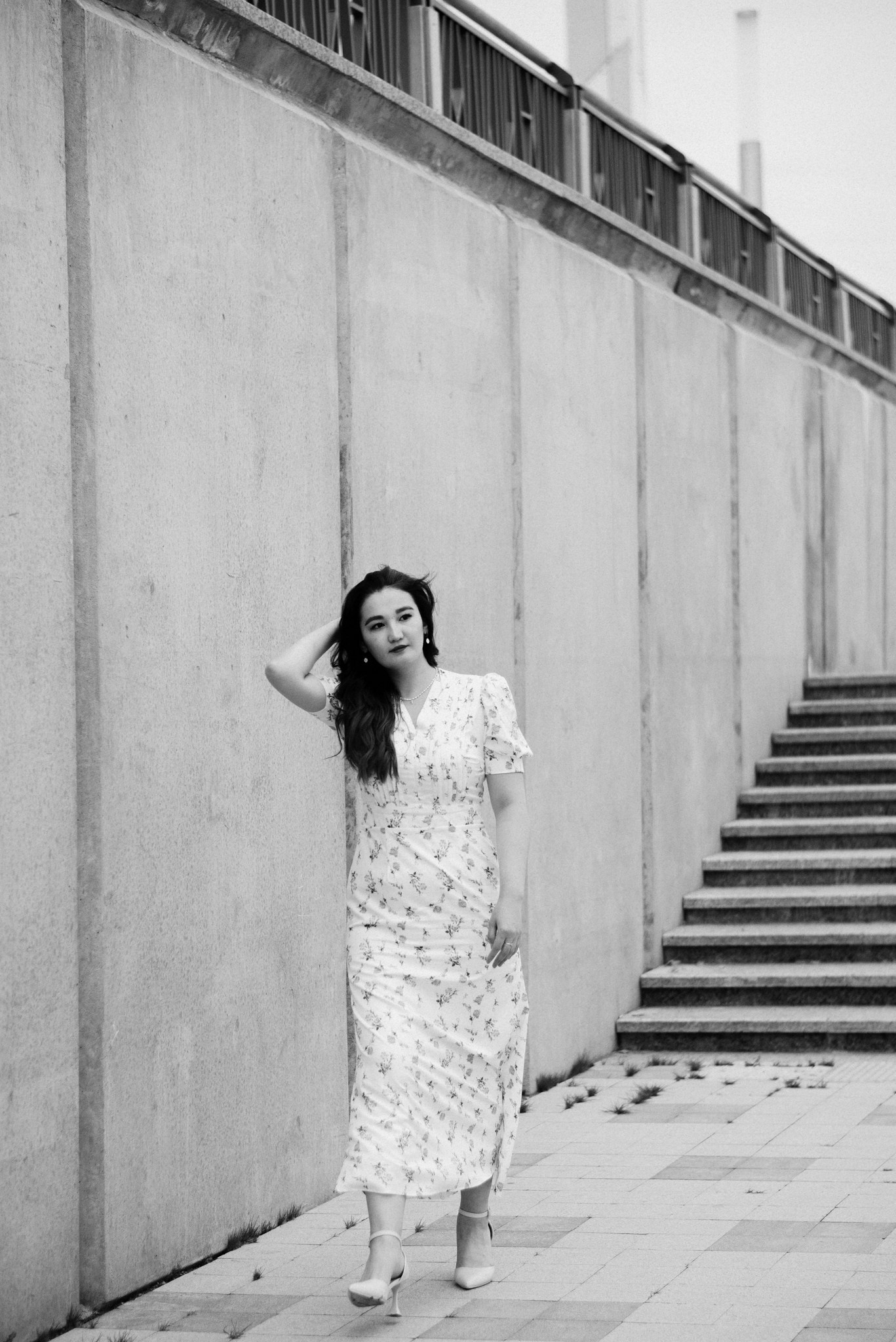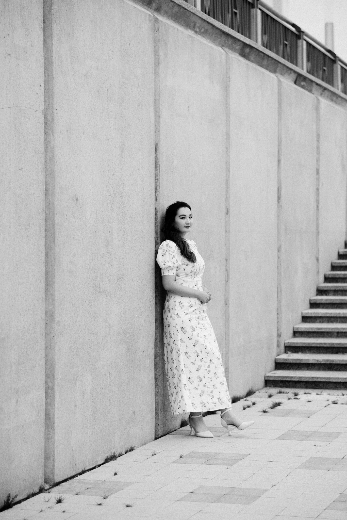 Завершили мы прогулку на набережной. Лаконичное платье Асель на фоне суровых бетонных стен — тот самый контраст нежности и города, который я так люблю.