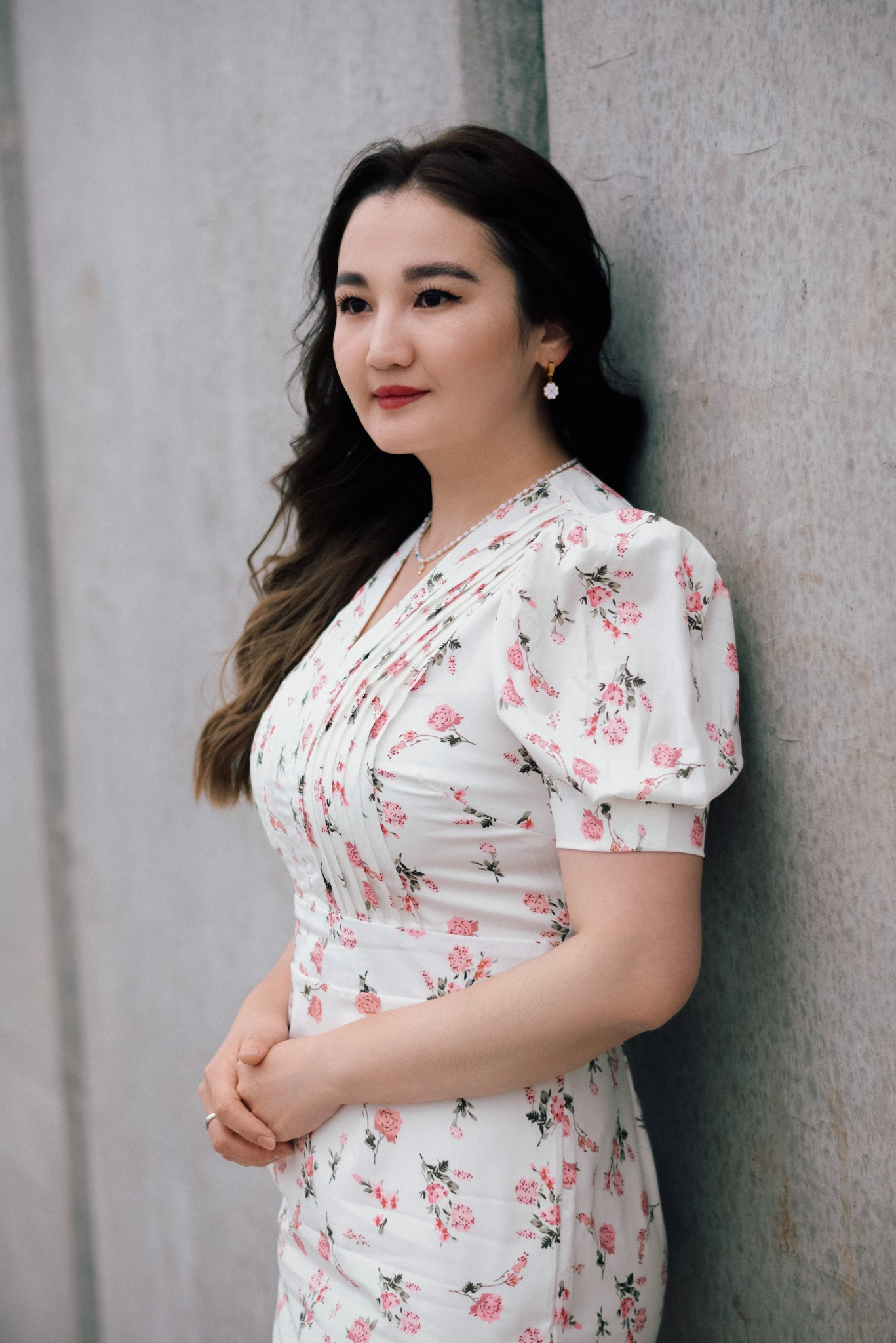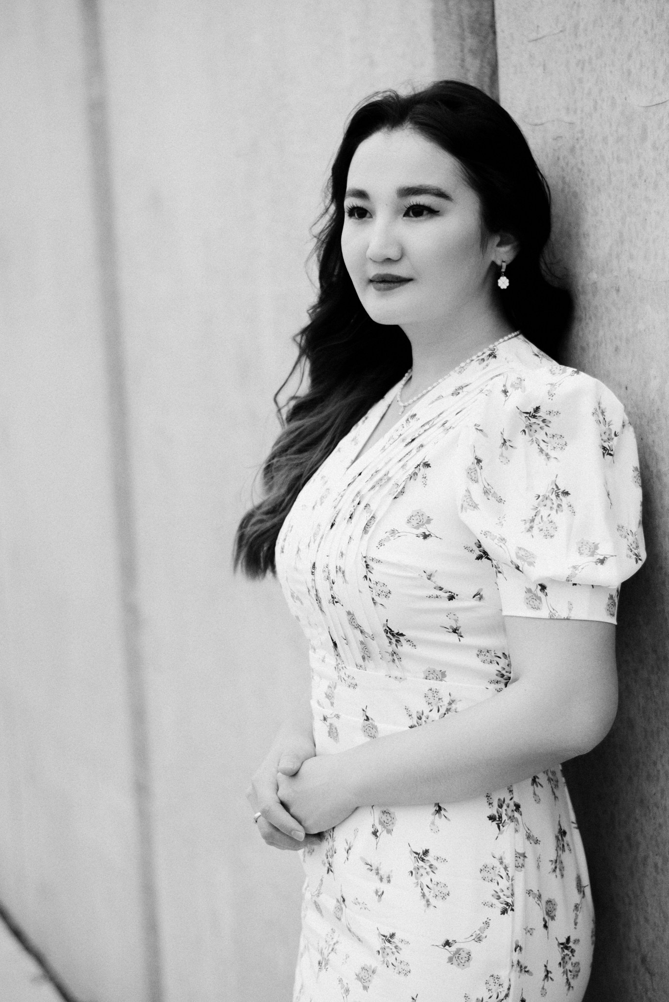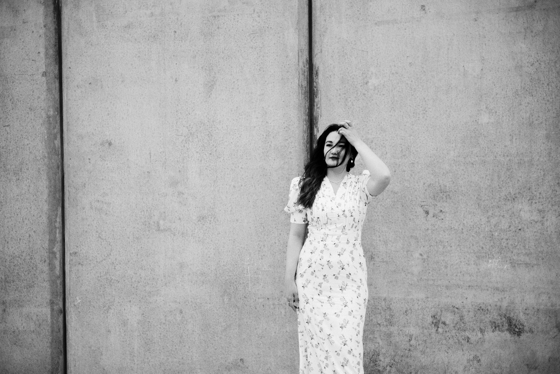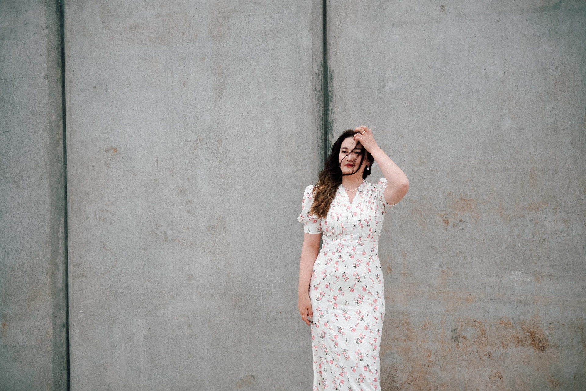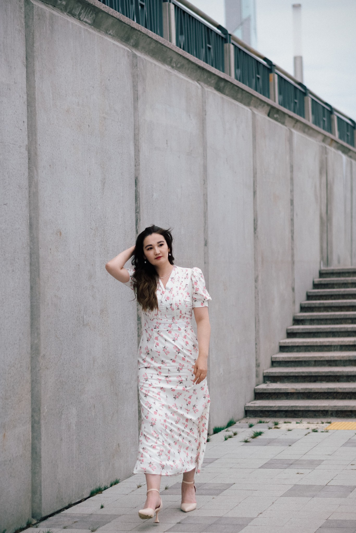 Завершили мы прогулку на набережной. Лаконичное платье Асель на фоне суровых бетонных стен — тот самый контраст нежности и города, который я так люблю.