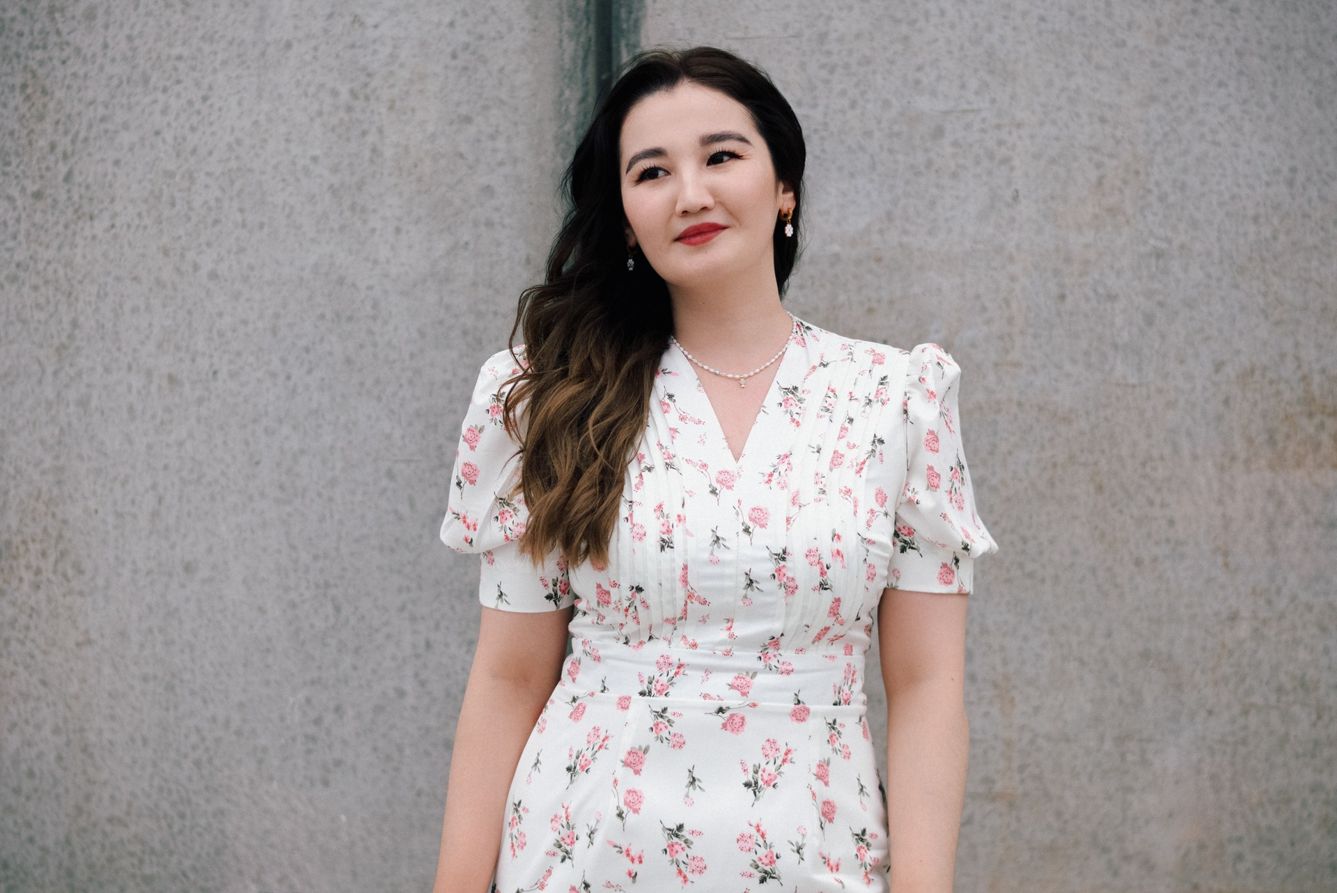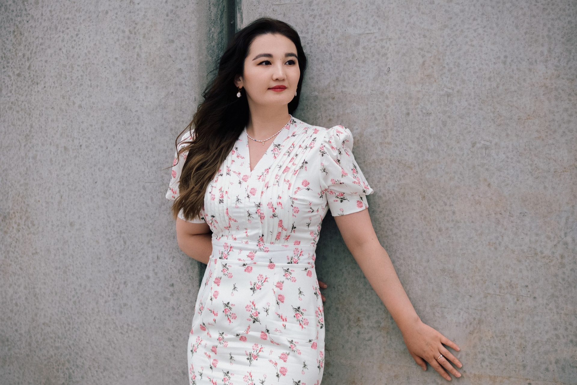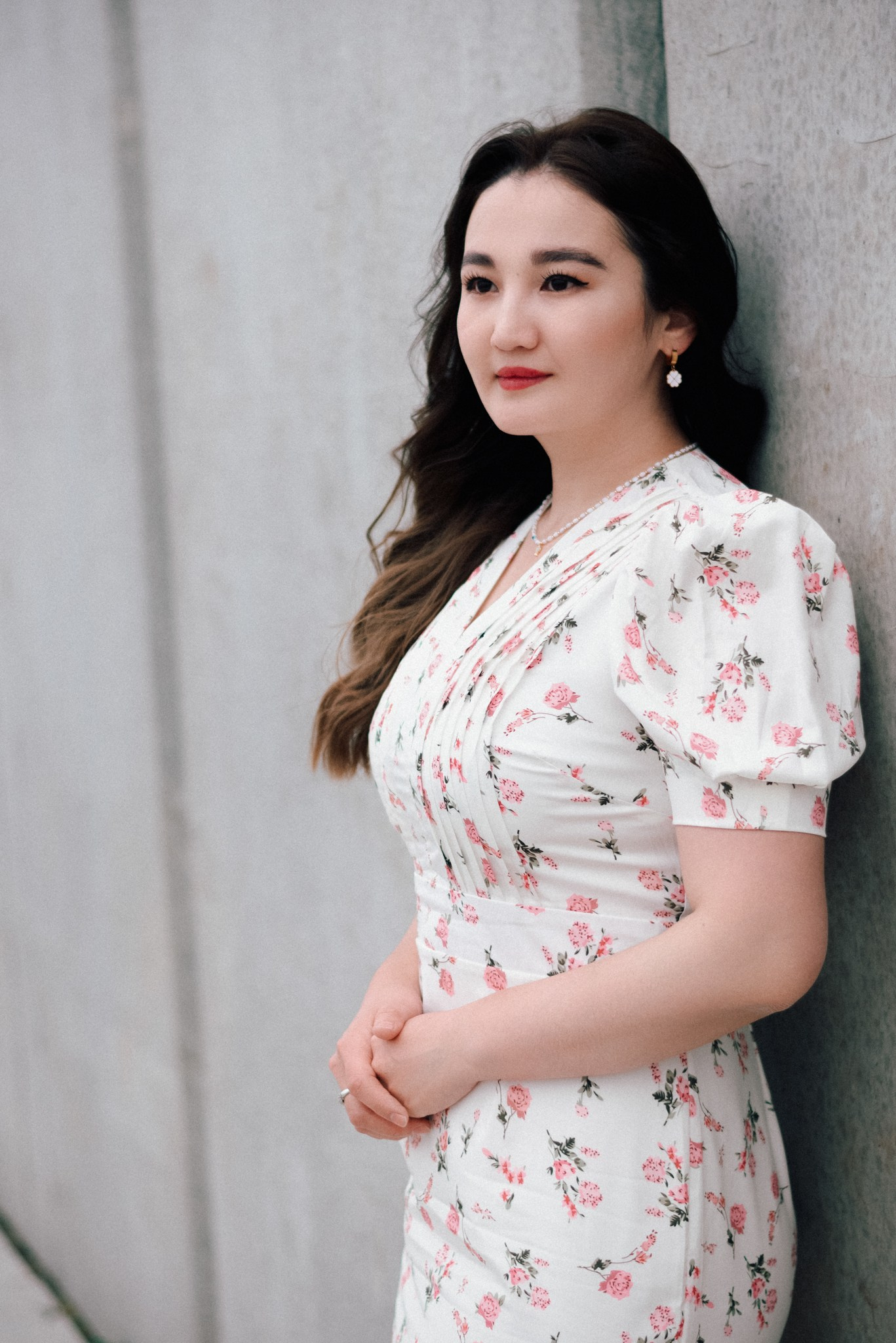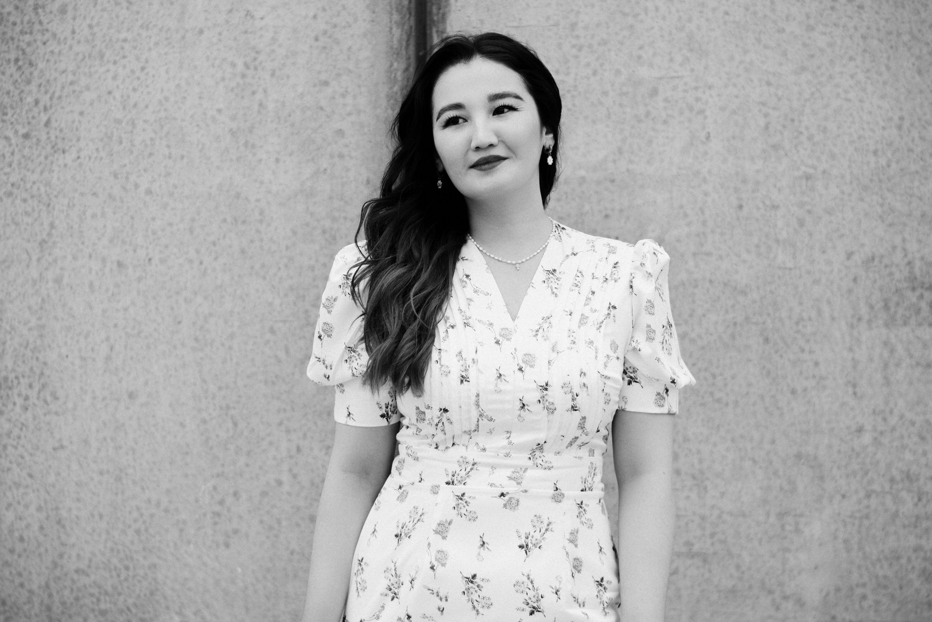 Завершили мы прогулку на набережной. Лаконичное платье Асель на фоне суровых бетонных стен — тот самый контраст нежности и города, который я так люблю.