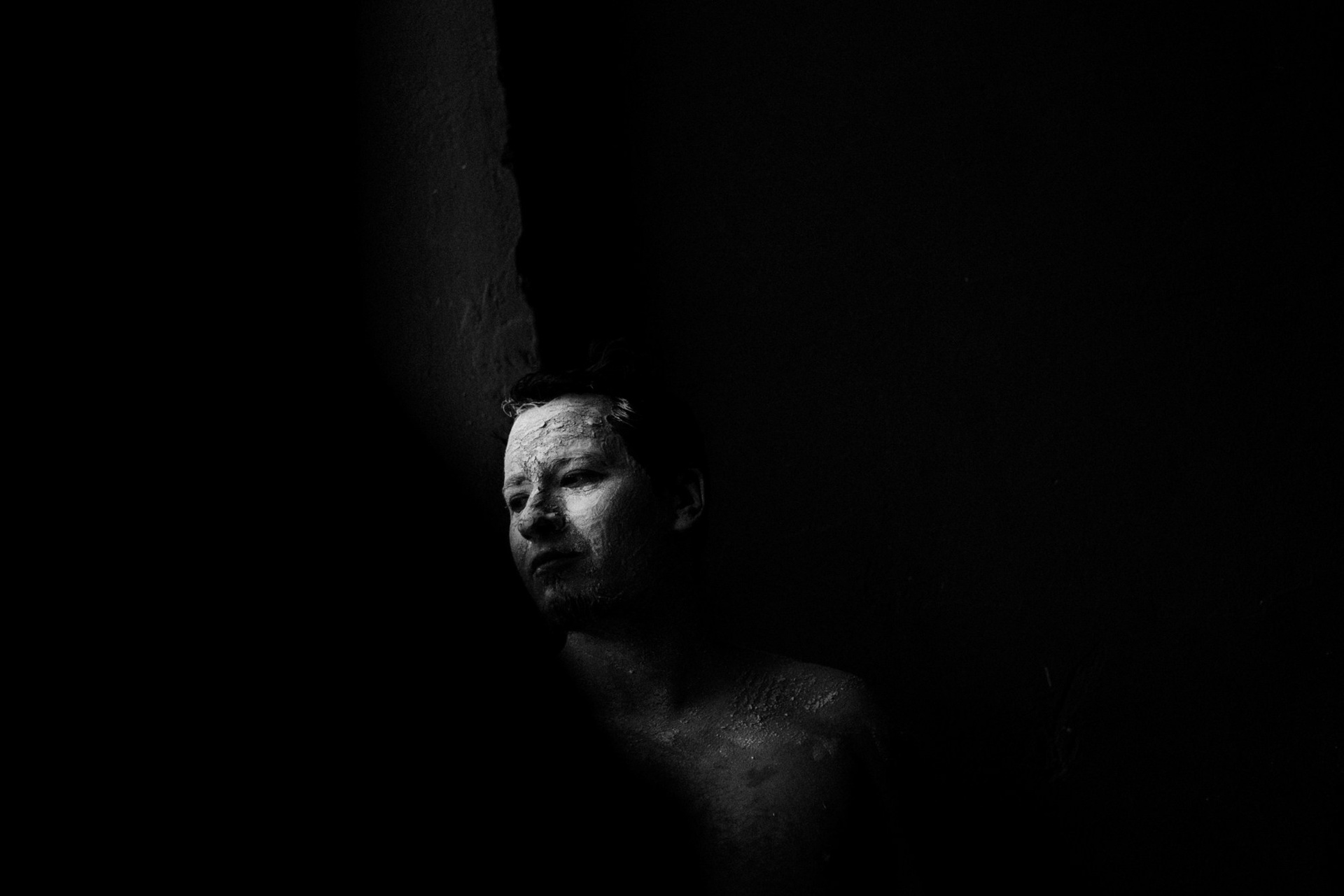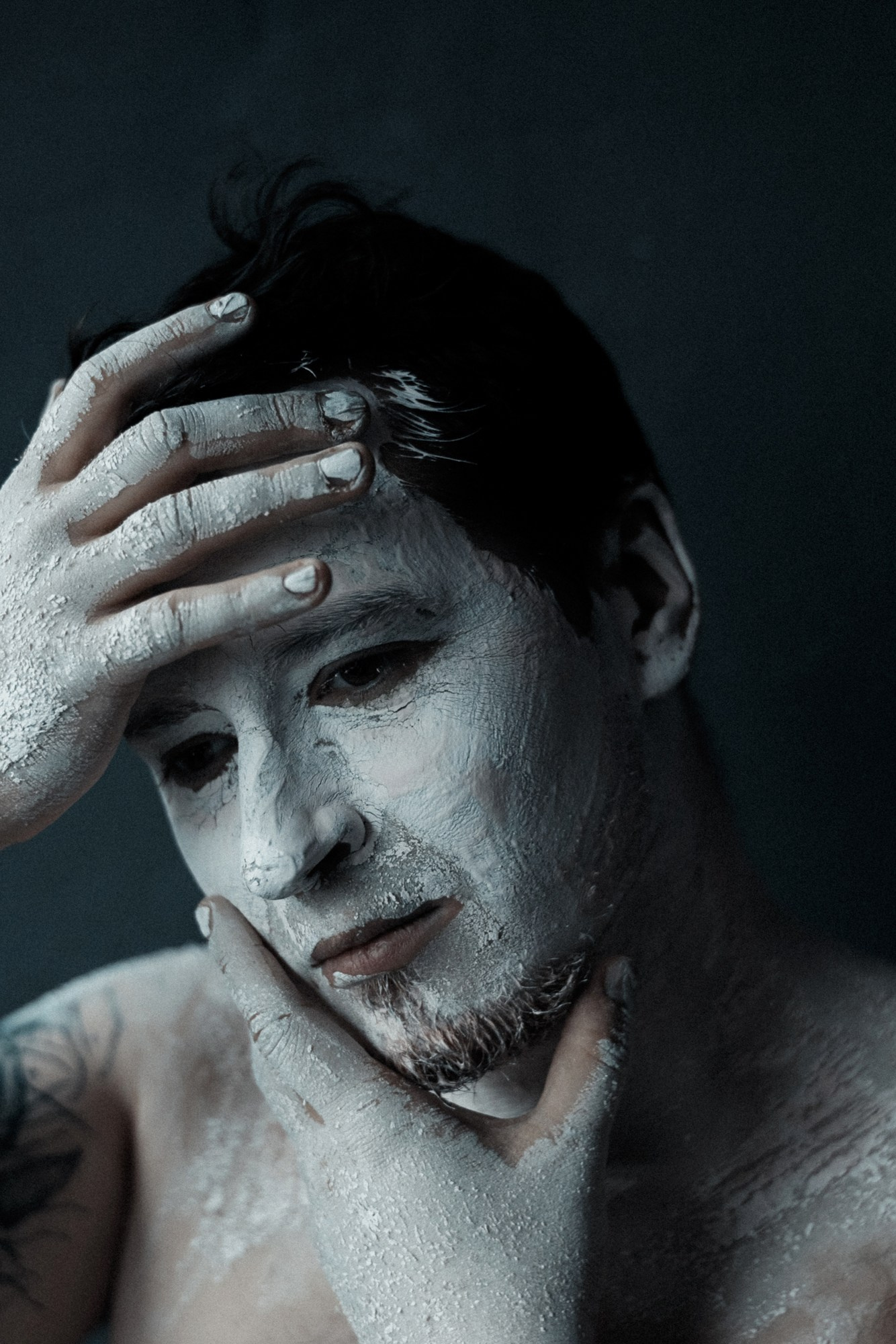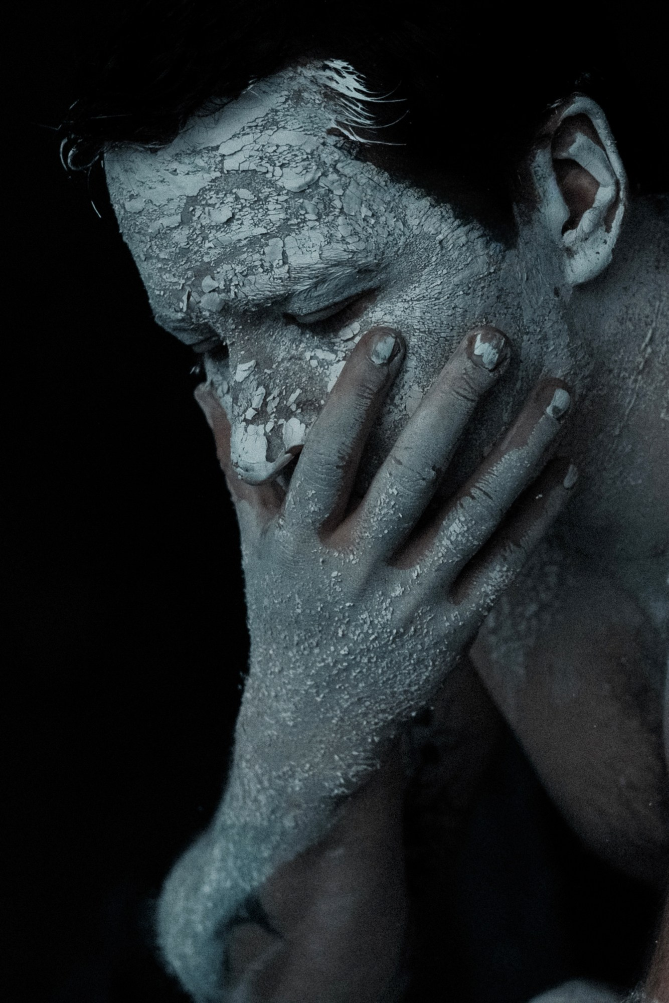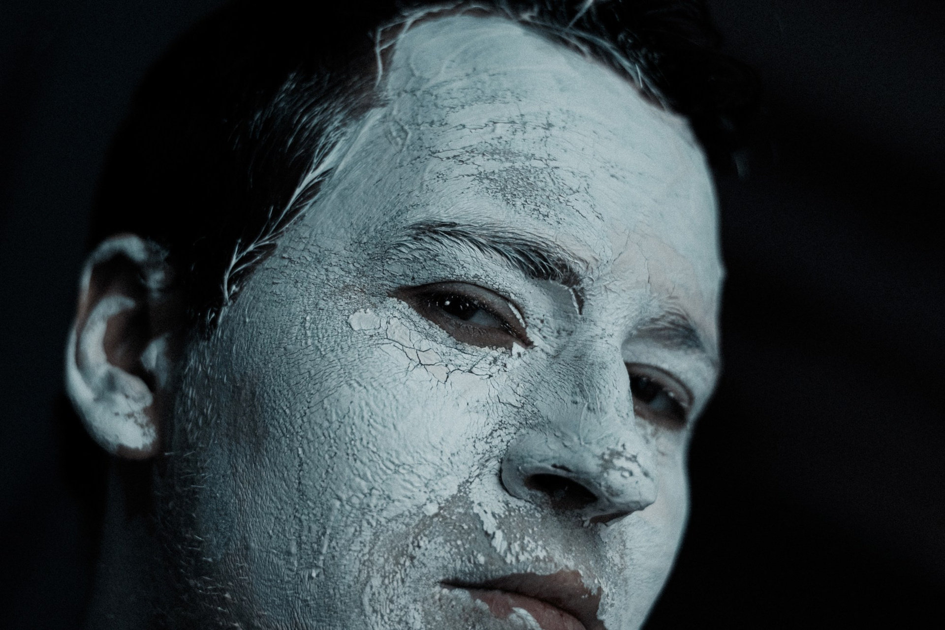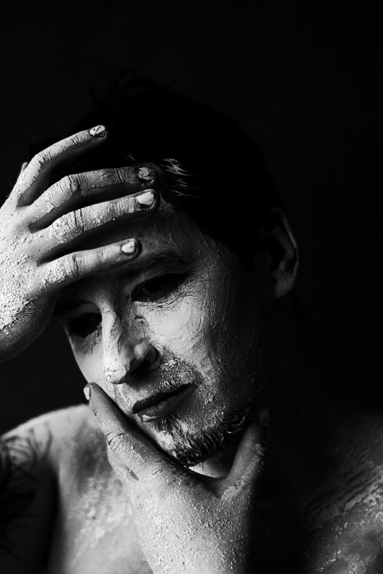 В день съёмки я попросила его приехать пораньше и прямо в студии нанесла ему на лицо белую глину.