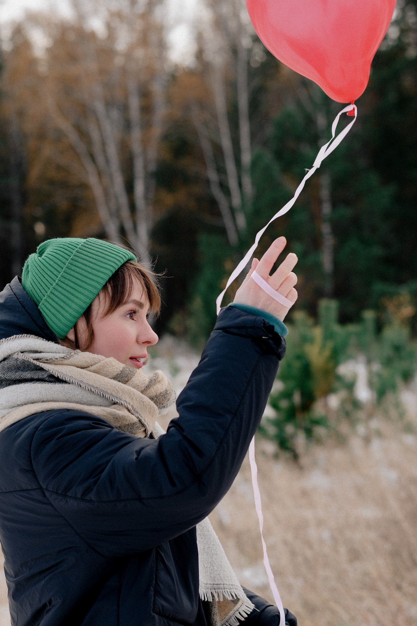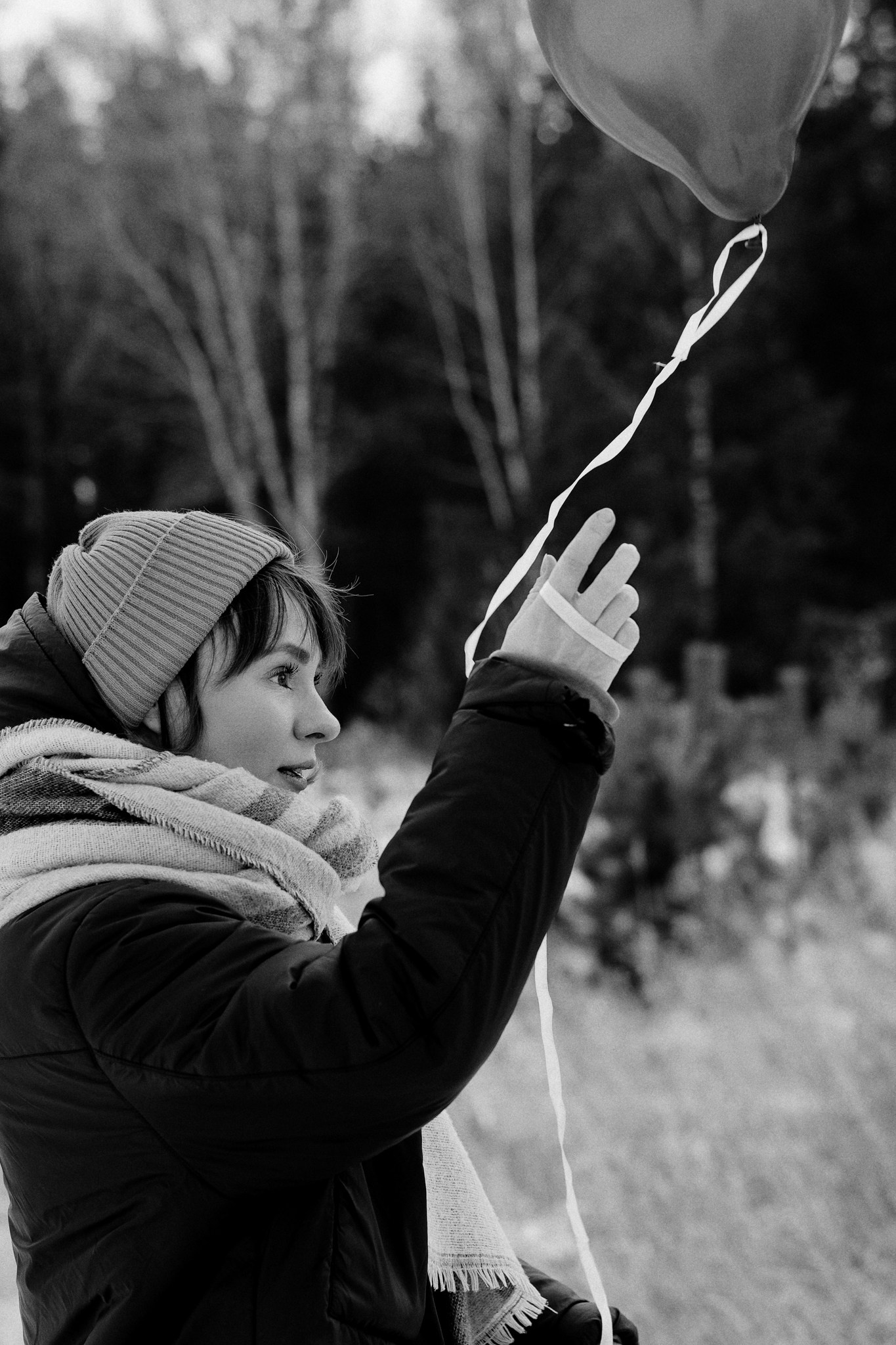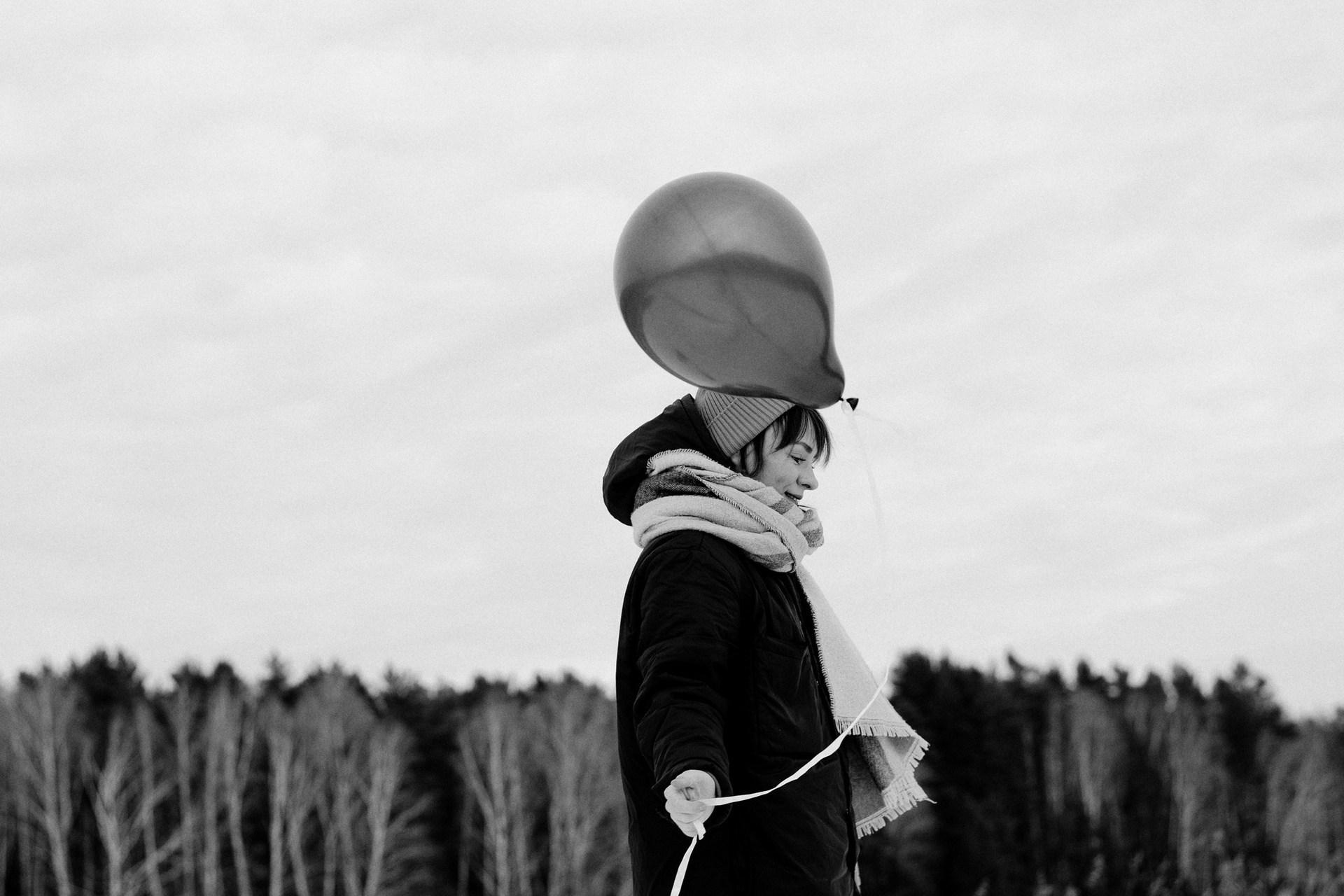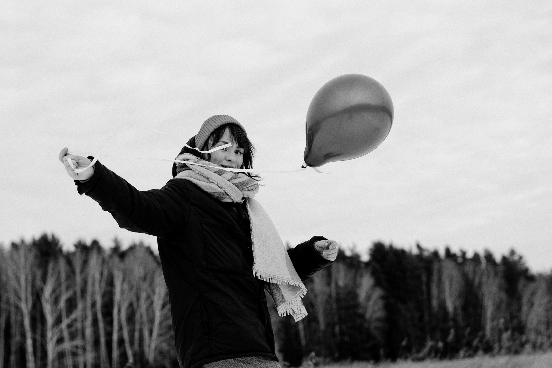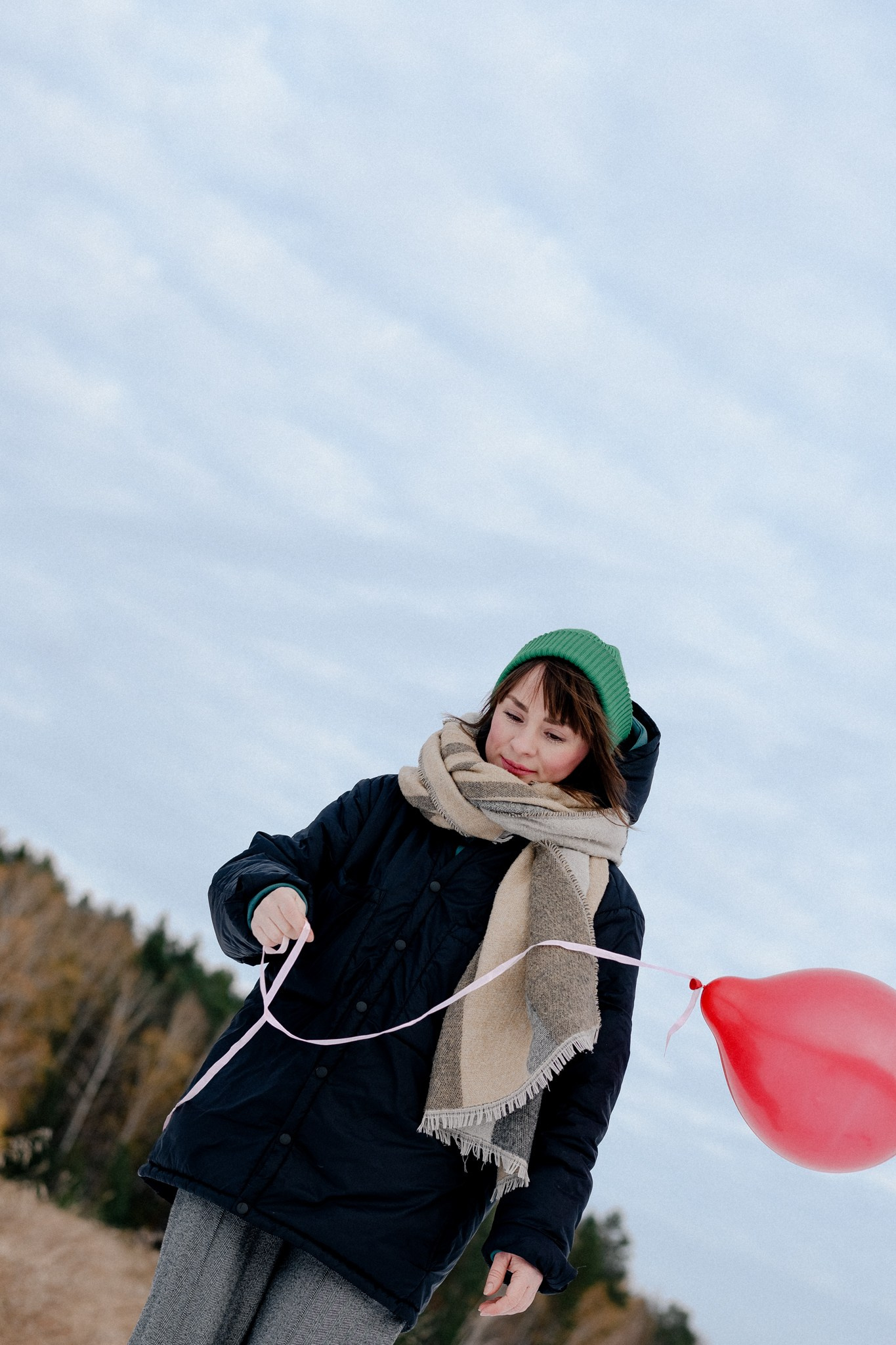 За несколько часов пути вдоль полей и старого кладбища мы очень много болтали. Эти кадры — результат нашей долгой прогулки, приуроченной к её дню рождения. В них — тишина зимнего леса, искренность и капелька праздничного настроения с красным шаром среди леса.