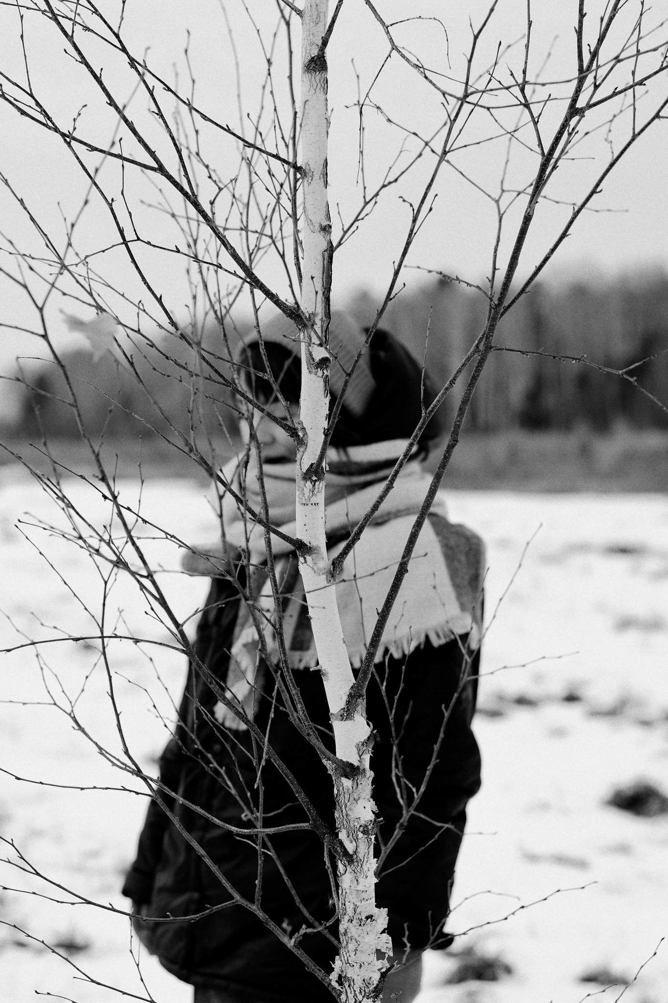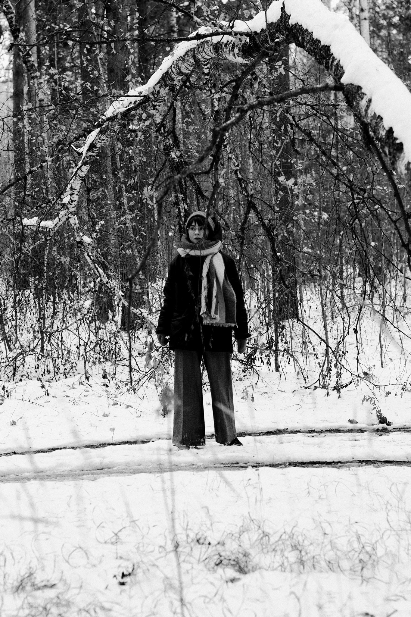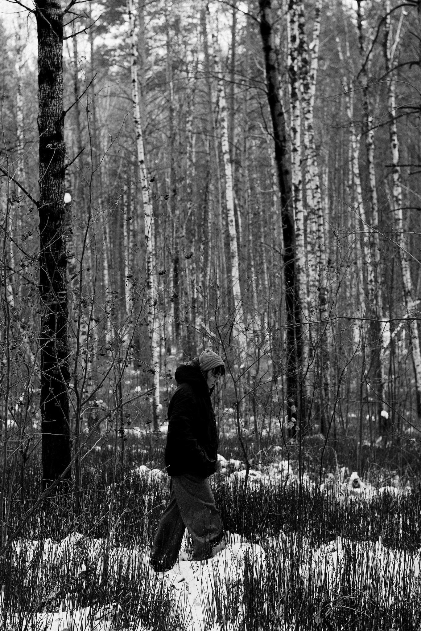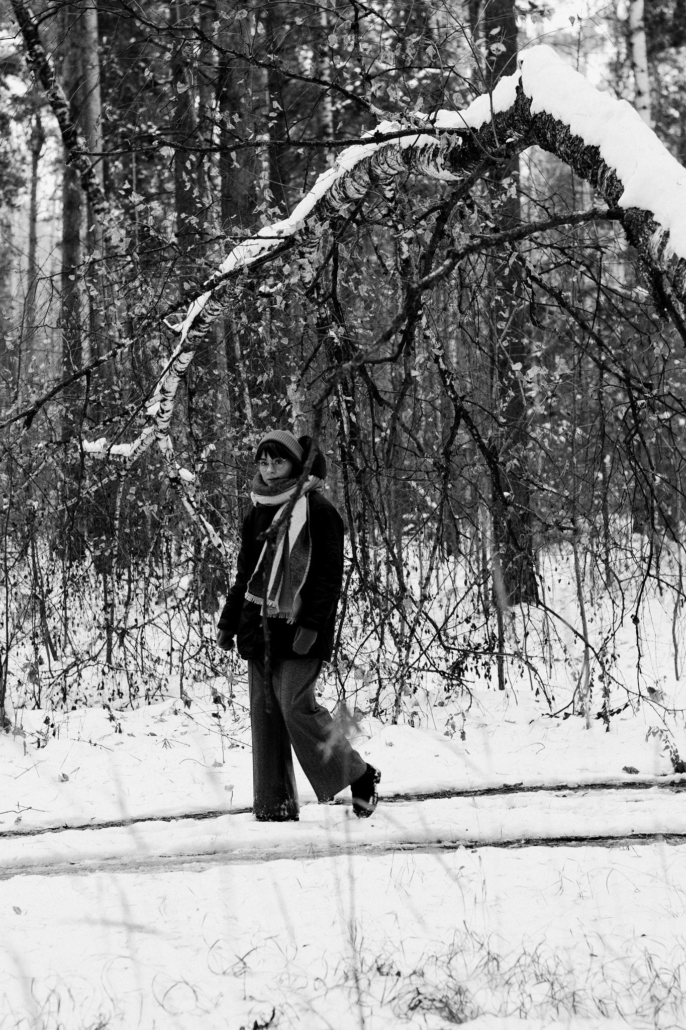 За несколько часов пути вдоль полей и старого кладбища мы очень много болтали. Эти кадры — результат нашей долгой прогулки, приуроченной к её дню рождения. В них — тишина зимнего леса, искренность и капелька праздничного настроения с красным шаром среди леса.