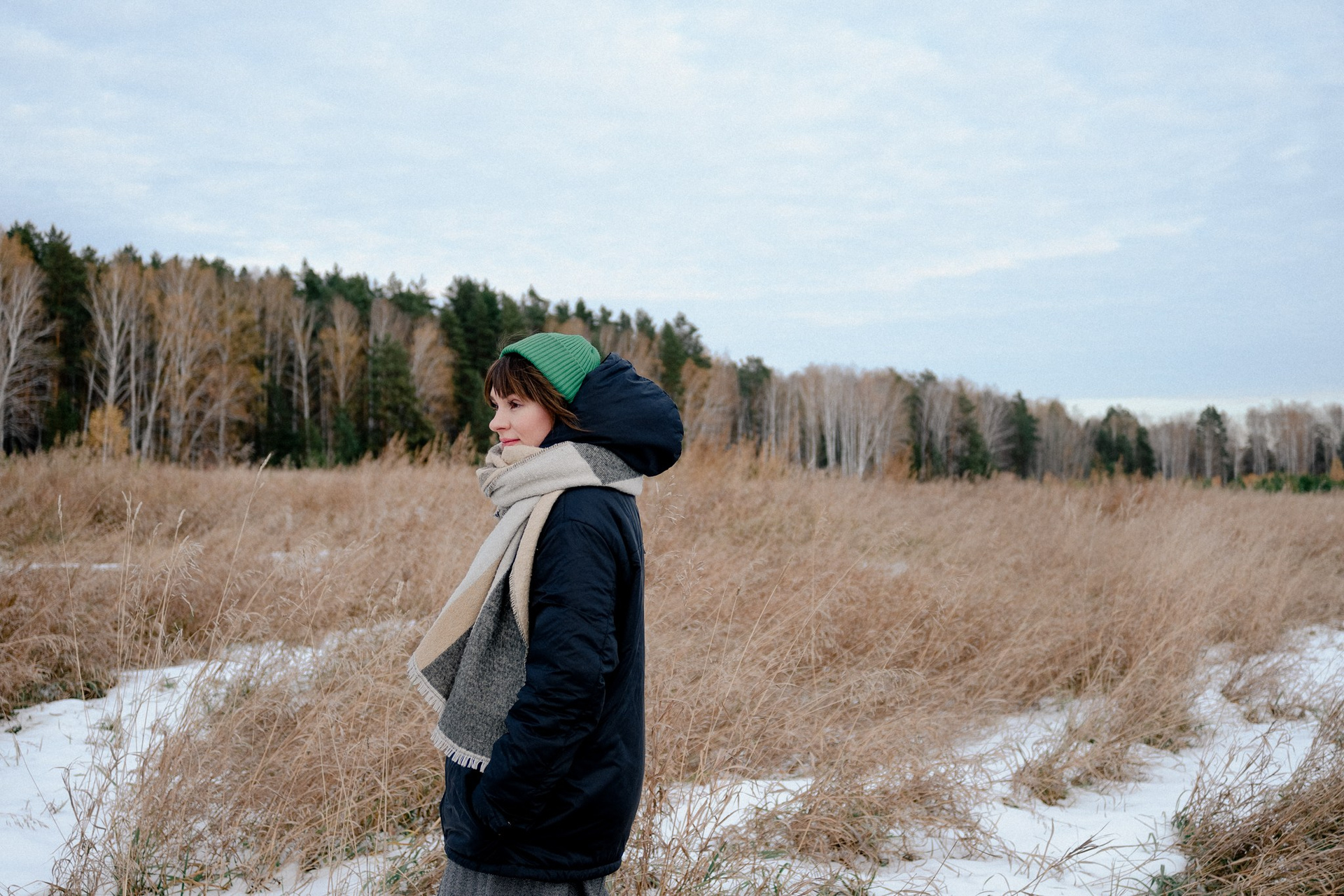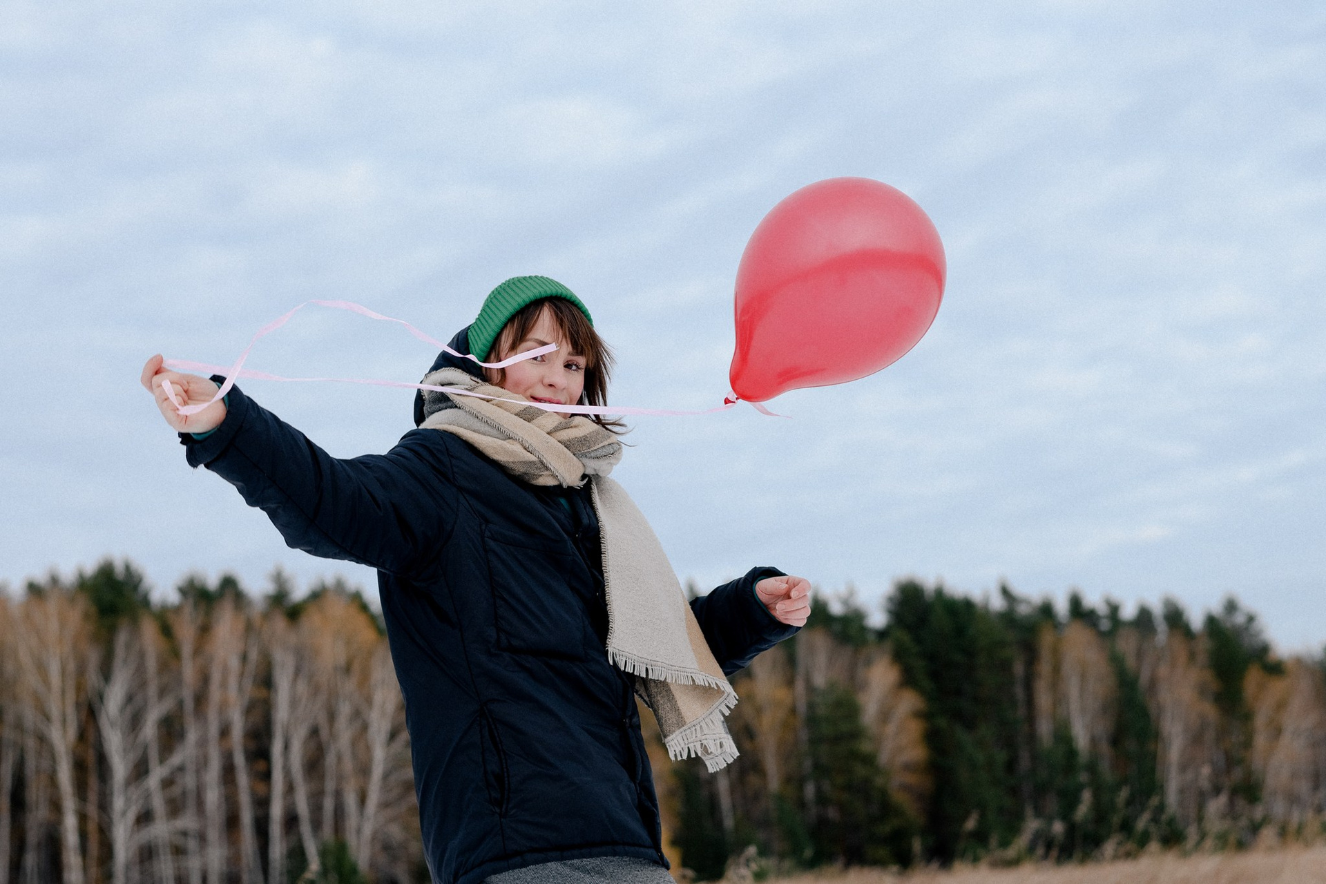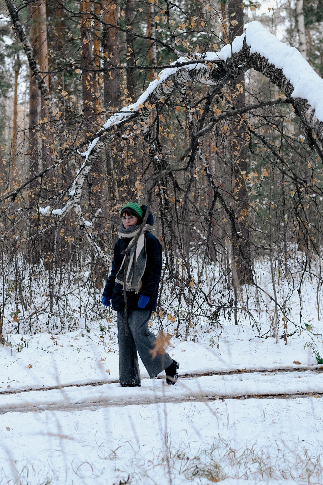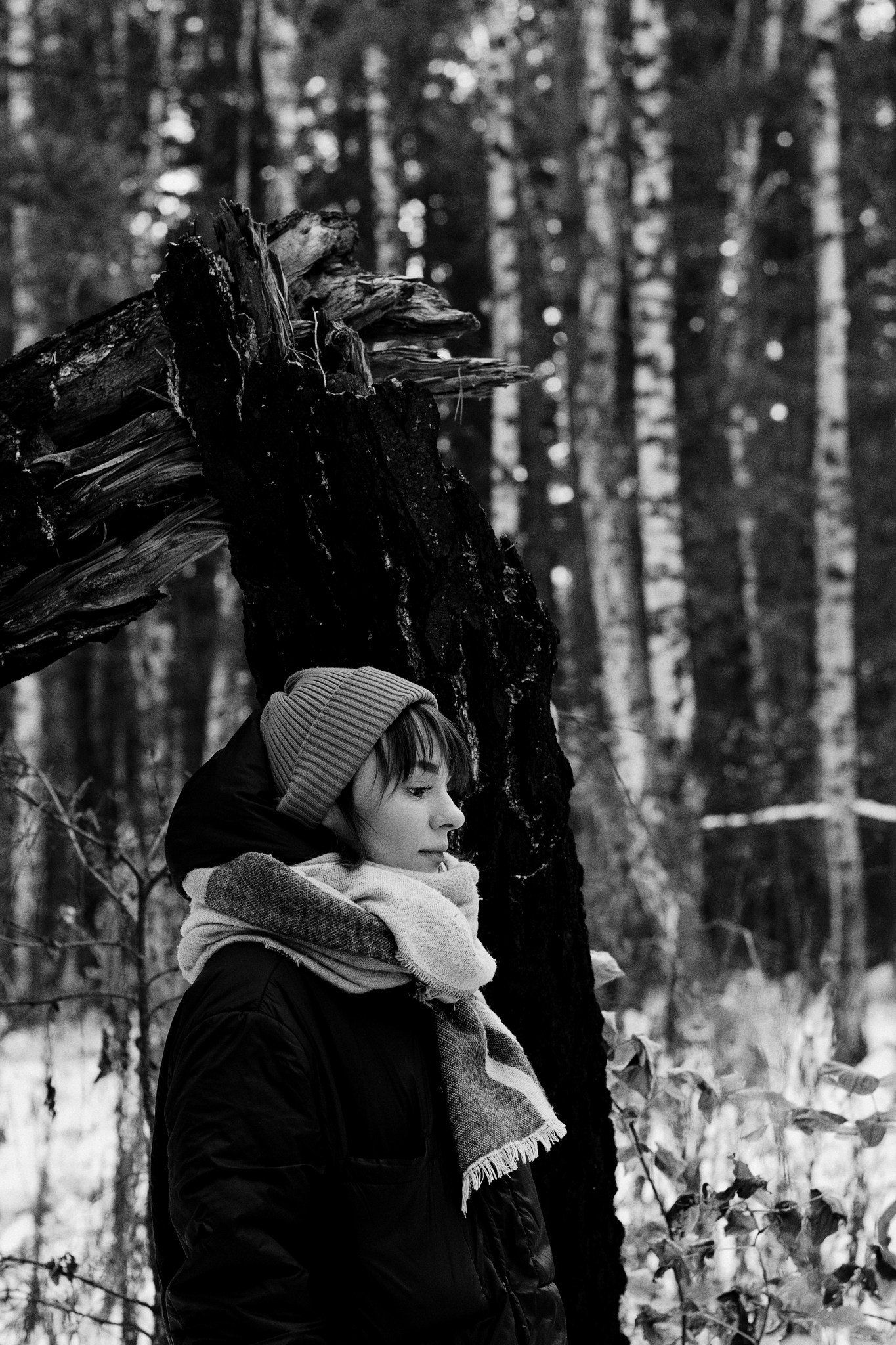 За несколько часов пути вдоль полей и старого кладбища мы очень много болтали. Эти кадры — результат нашей долгой прогулки, приуроченной к её дню рождения. В них — тишина зимнего леса, искренность и капелька праздничного настроения с красным шаром среди леса.