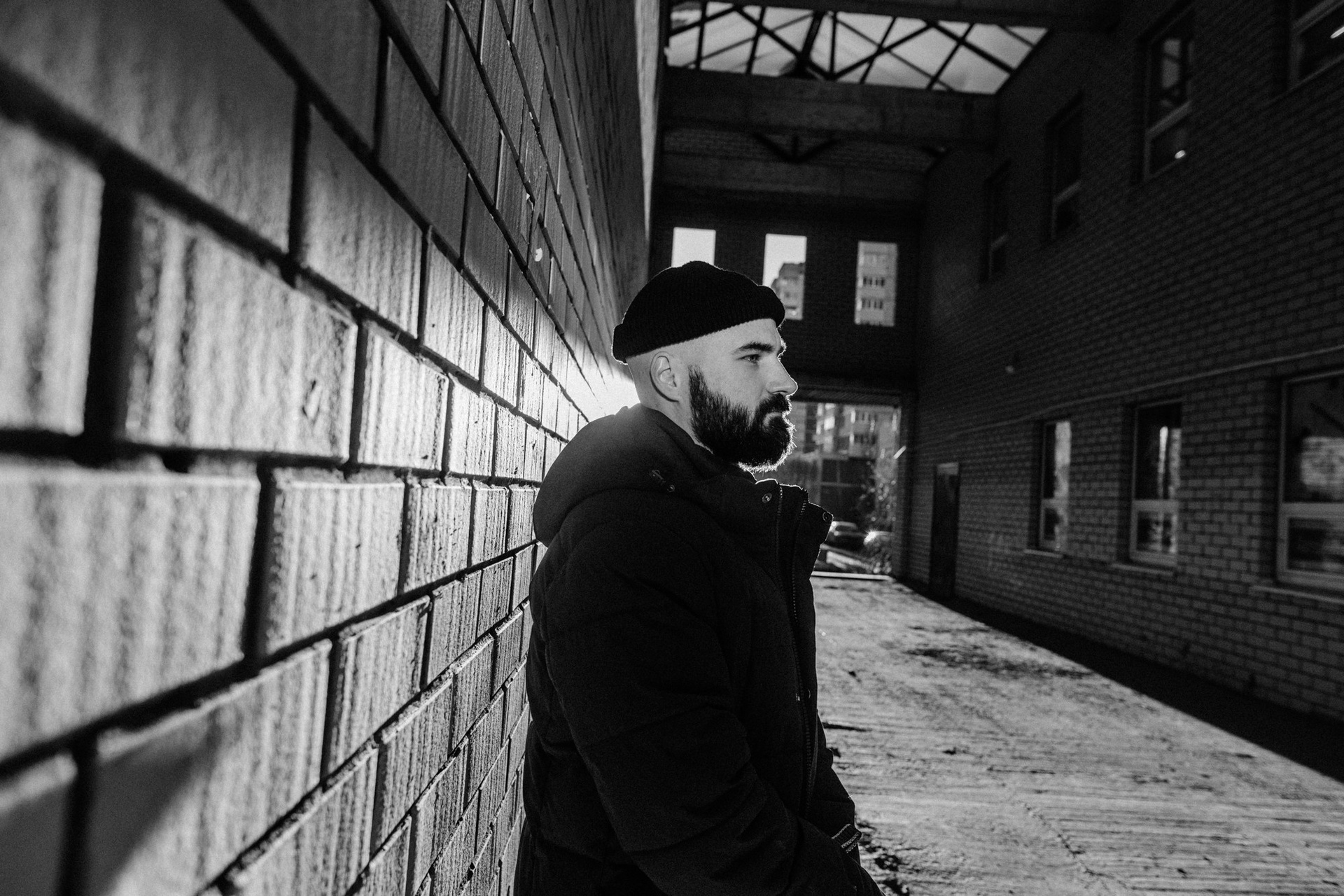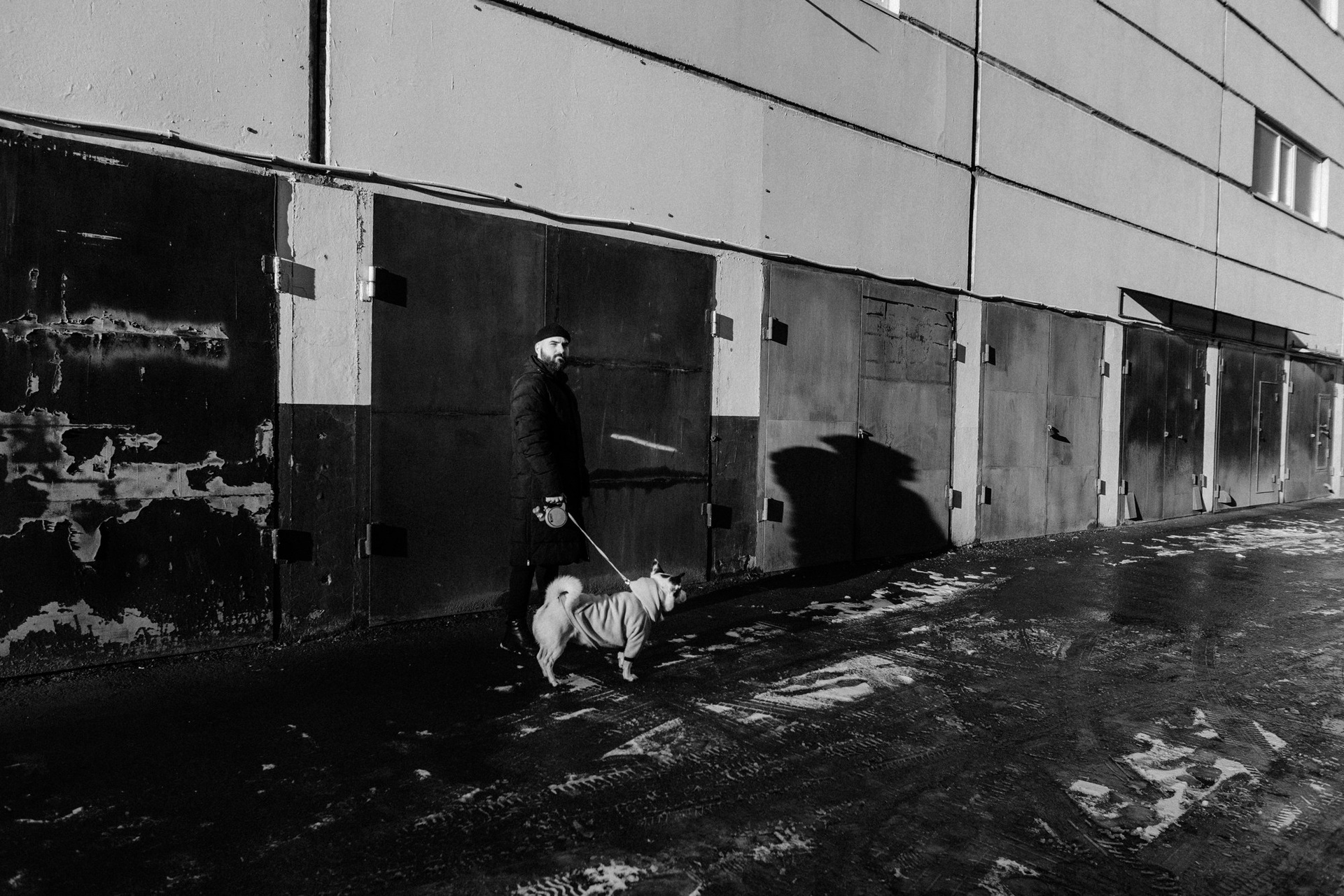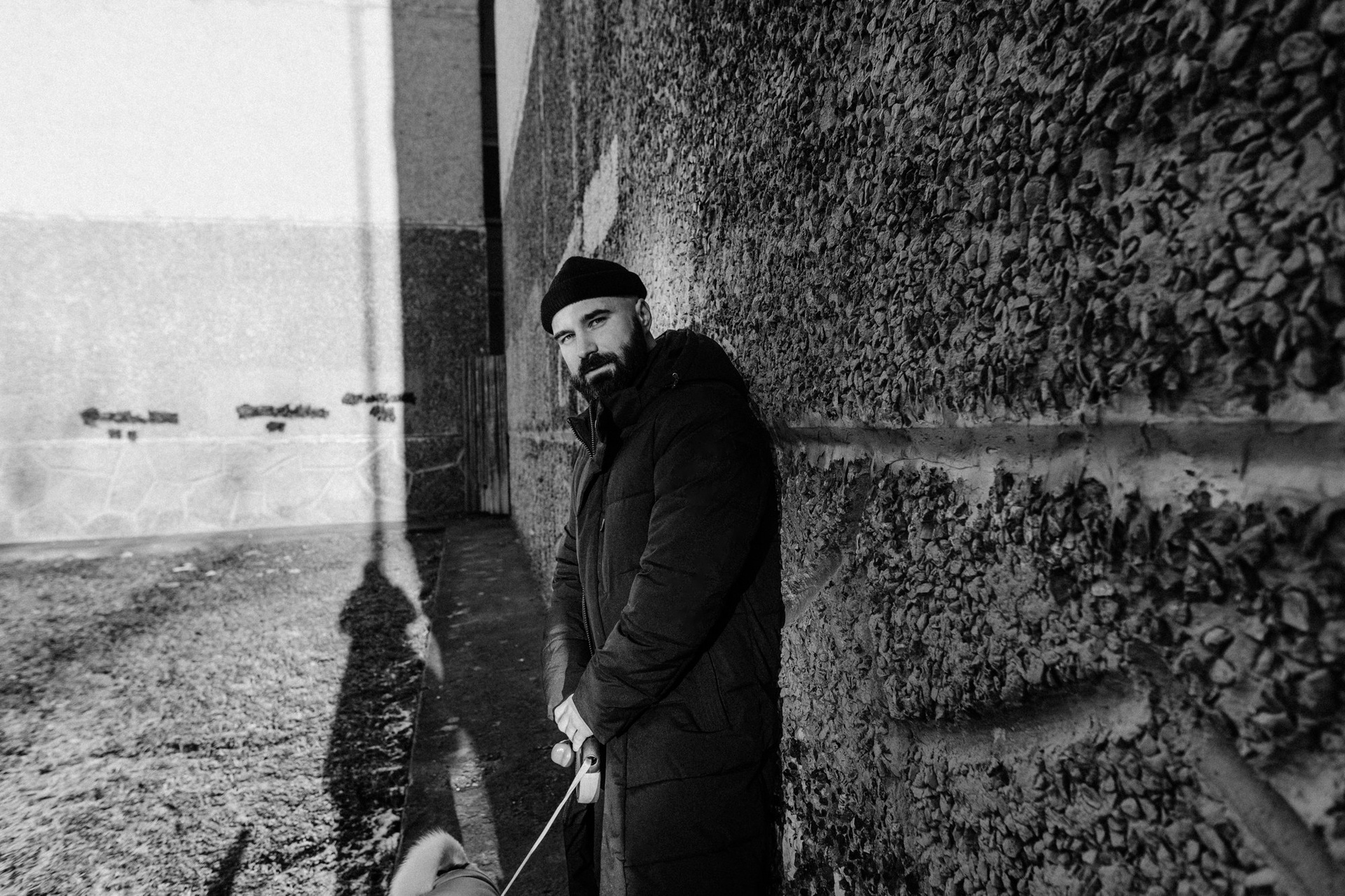 Это была уже вторая наша съемка с Сашей. В этот раз он пришел с конкретным запросом — хотел черно-белую серию в своем районе. На улице был ноябрь: мороз, грязь и серость. Казалось бы, совсем не время для уличных прогулок, но мы решили доказать обратное. Мы просто ходили между панелек и гаражей, ловили моменты и искали фактурные стенки. Главным героем был пес Тони. Чтобы он соглашался позировать и смотрел в камеру, Саше пришлось постоянно подкупать его сыром. Это было очень искренне и весело. Эта серия для меня — про то, что крутые кадры можно найти даже в соседнем дворе, если есть правильное настроение и доверие.