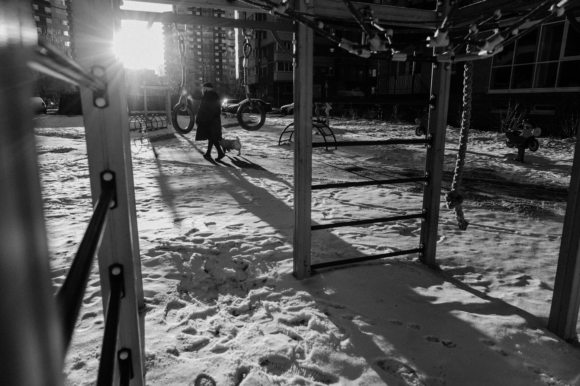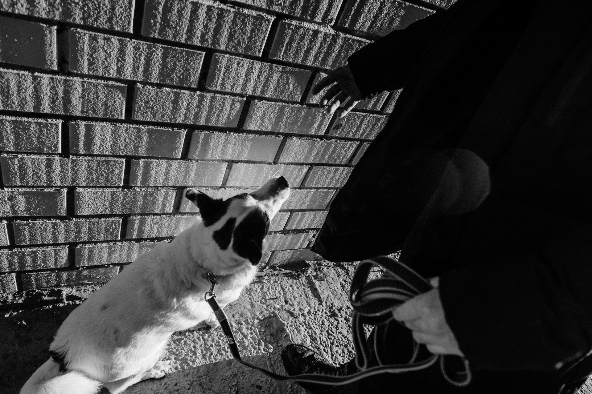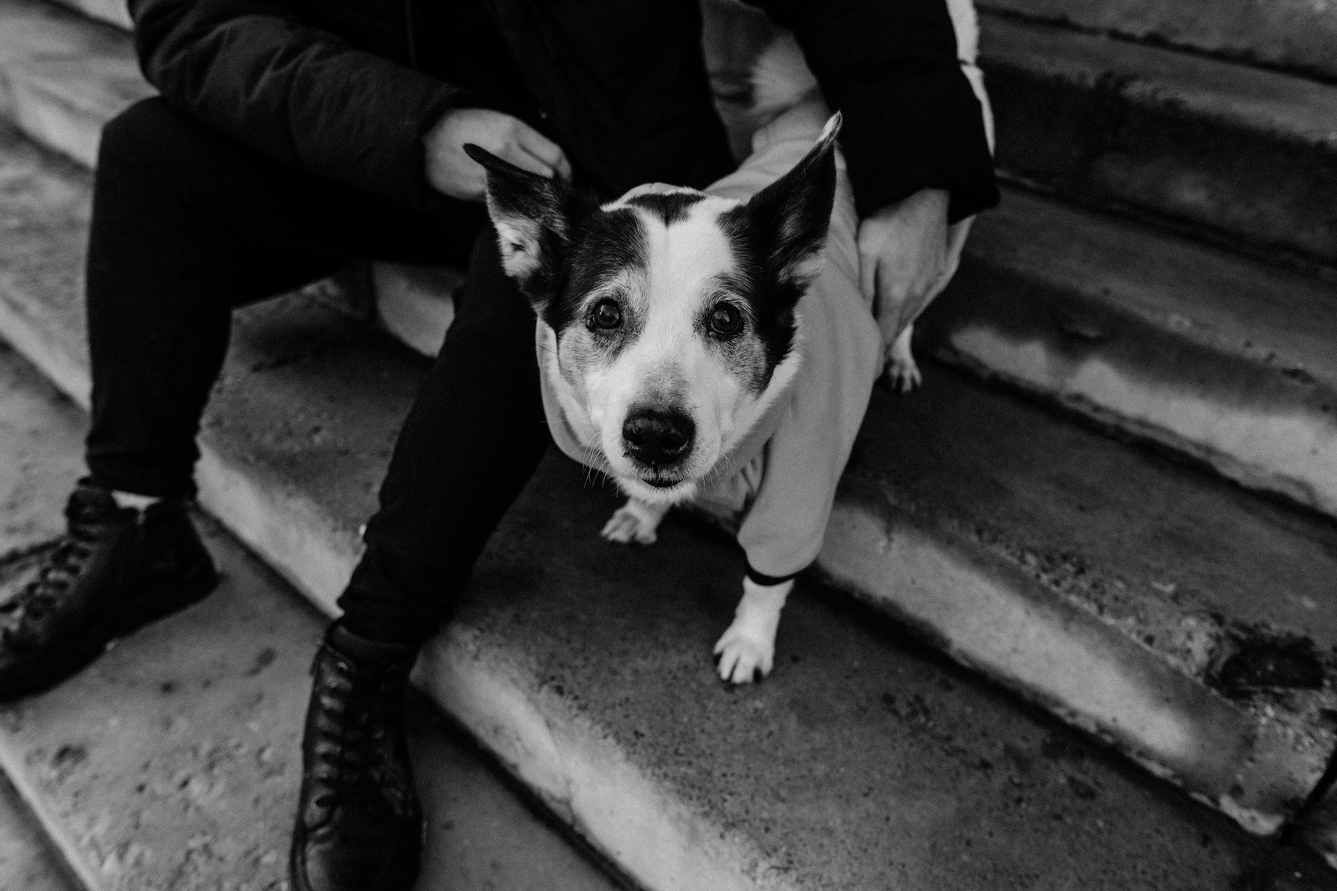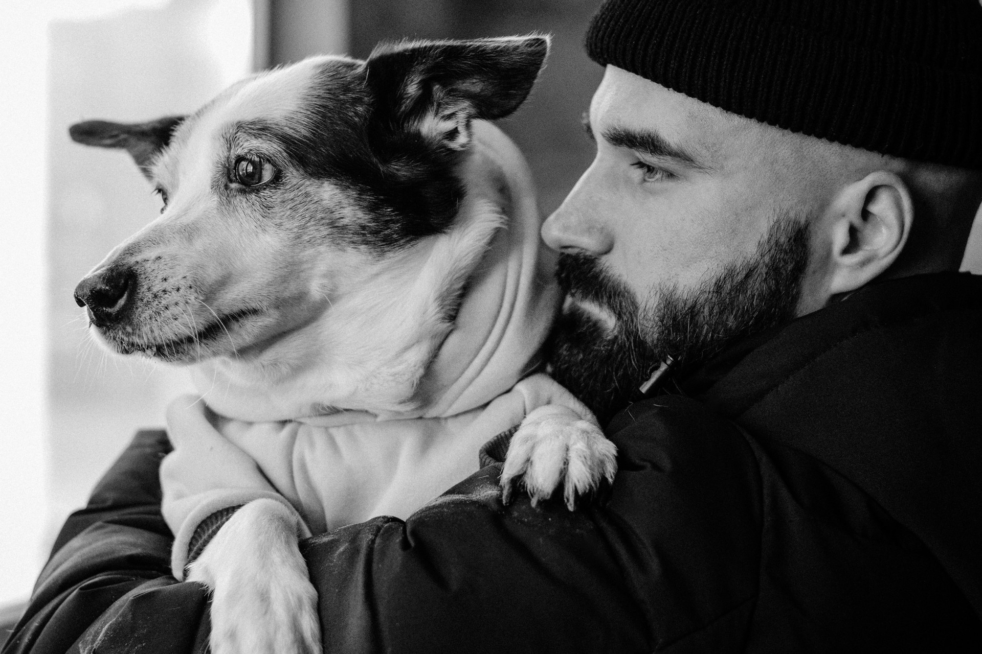 Это была уже вторая наша съемка с Сашей. В этот раз он пришел с конкретным запросом — хотел черно-белую серию в своем районе. На улице был ноябрь: мороз, грязь и серость. Казалось бы, совсем не время для уличных прогулок, но мы решили доказать обратное. Мы просто ходили между панелек и гаражей, ловили моменты и искали фактурные стенки. Главным героем был пес Тони. Чтобы он соглашался позировать и смотрел в камеру, Саше пришлось постоянно подкупать его сыром. Это было очень искренне и весело. Эта серия для меня — про то, что крутые кадры можно найти даже в соседнем дворе, если есть правильное настроение и доверие.