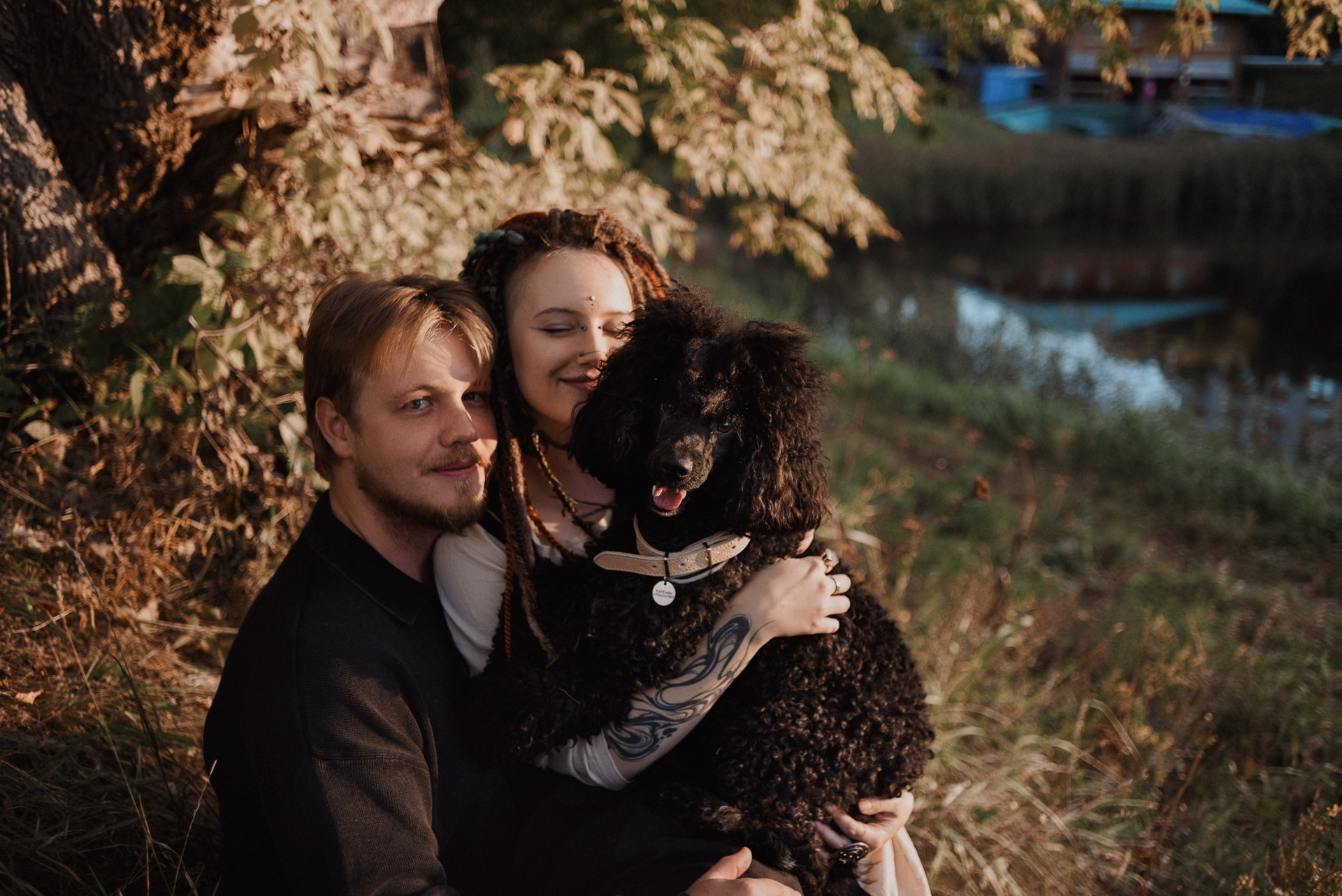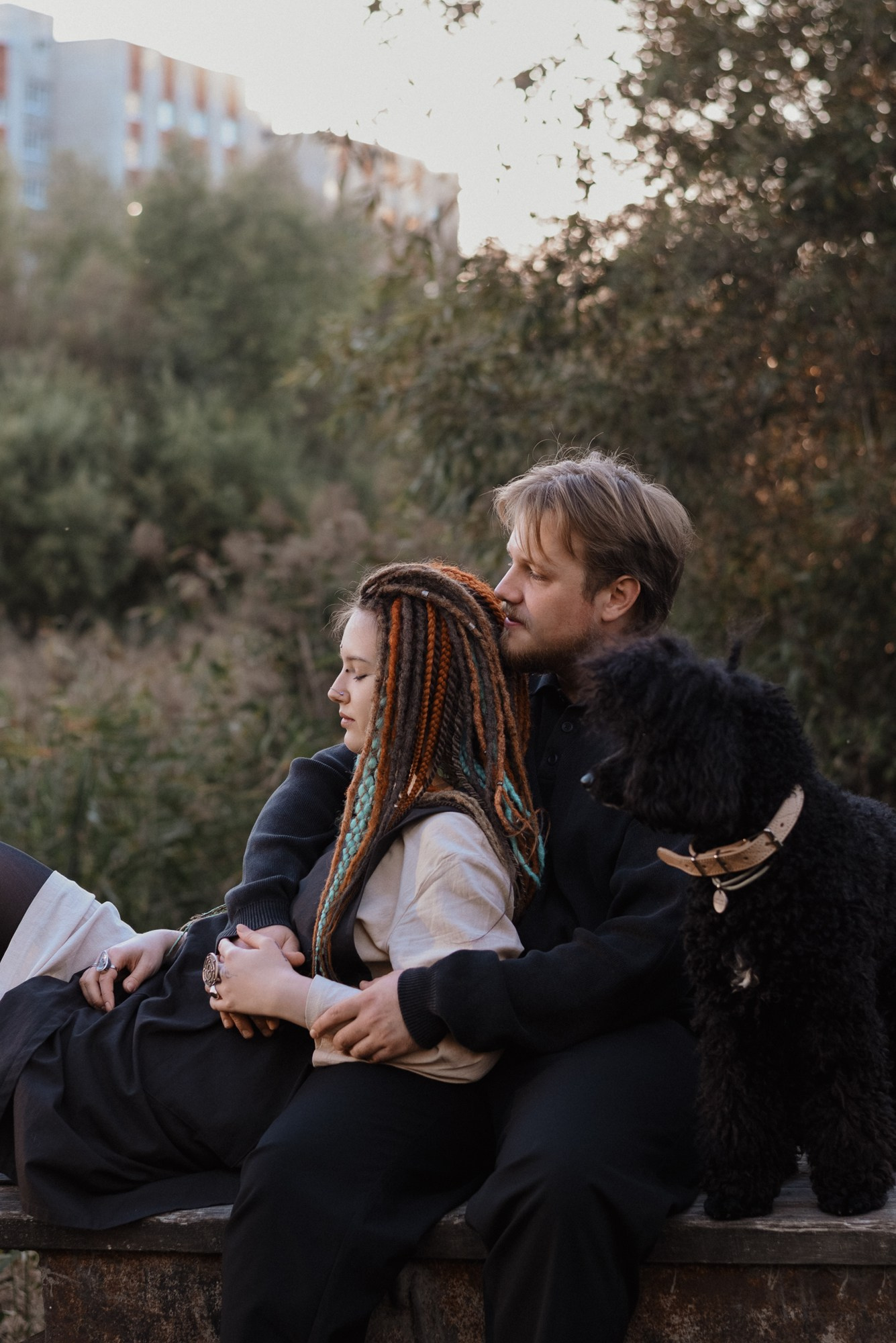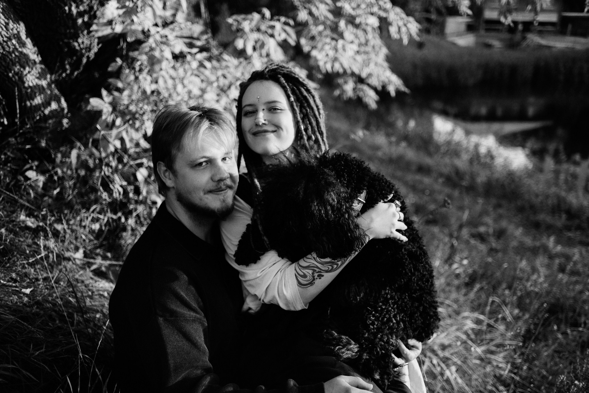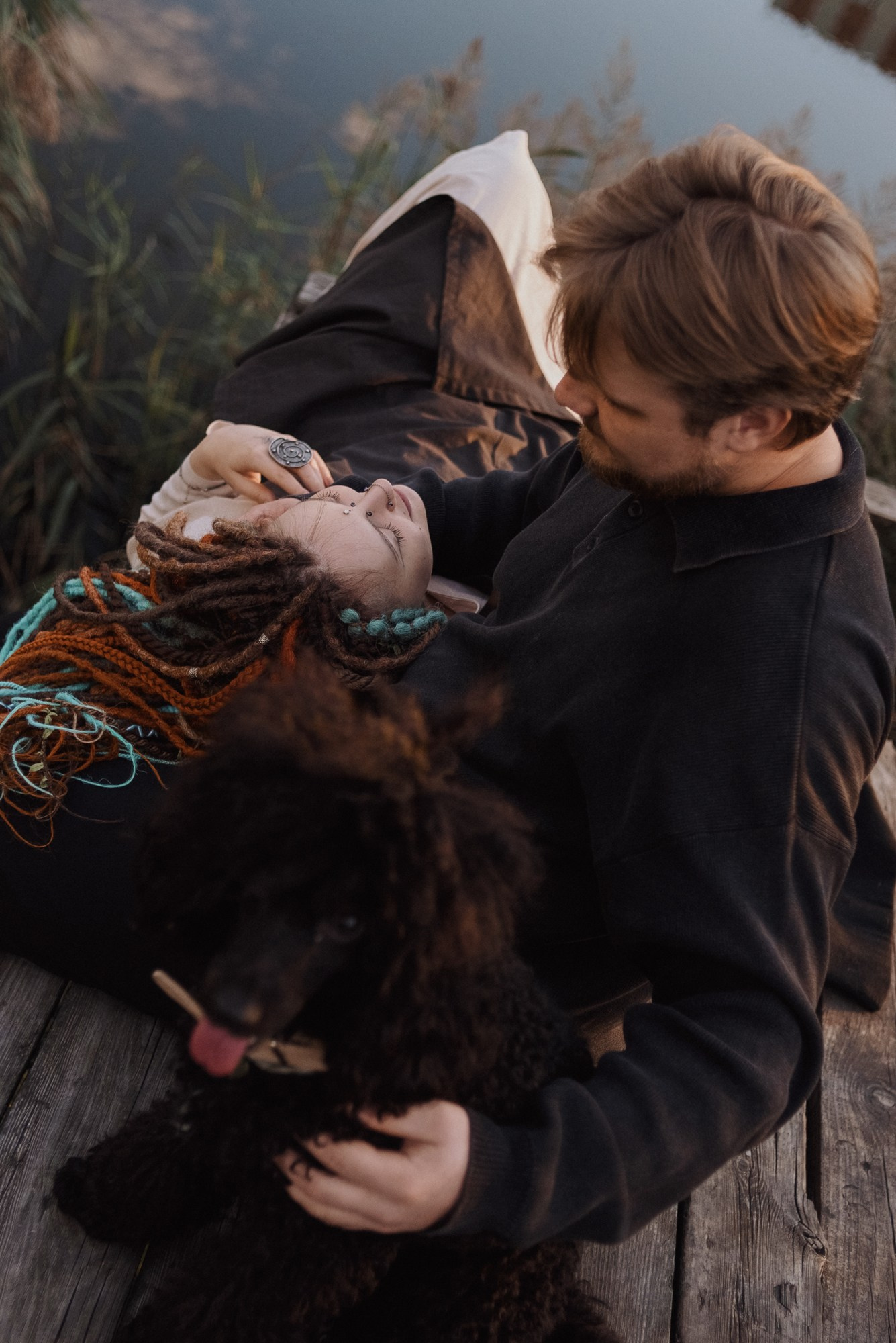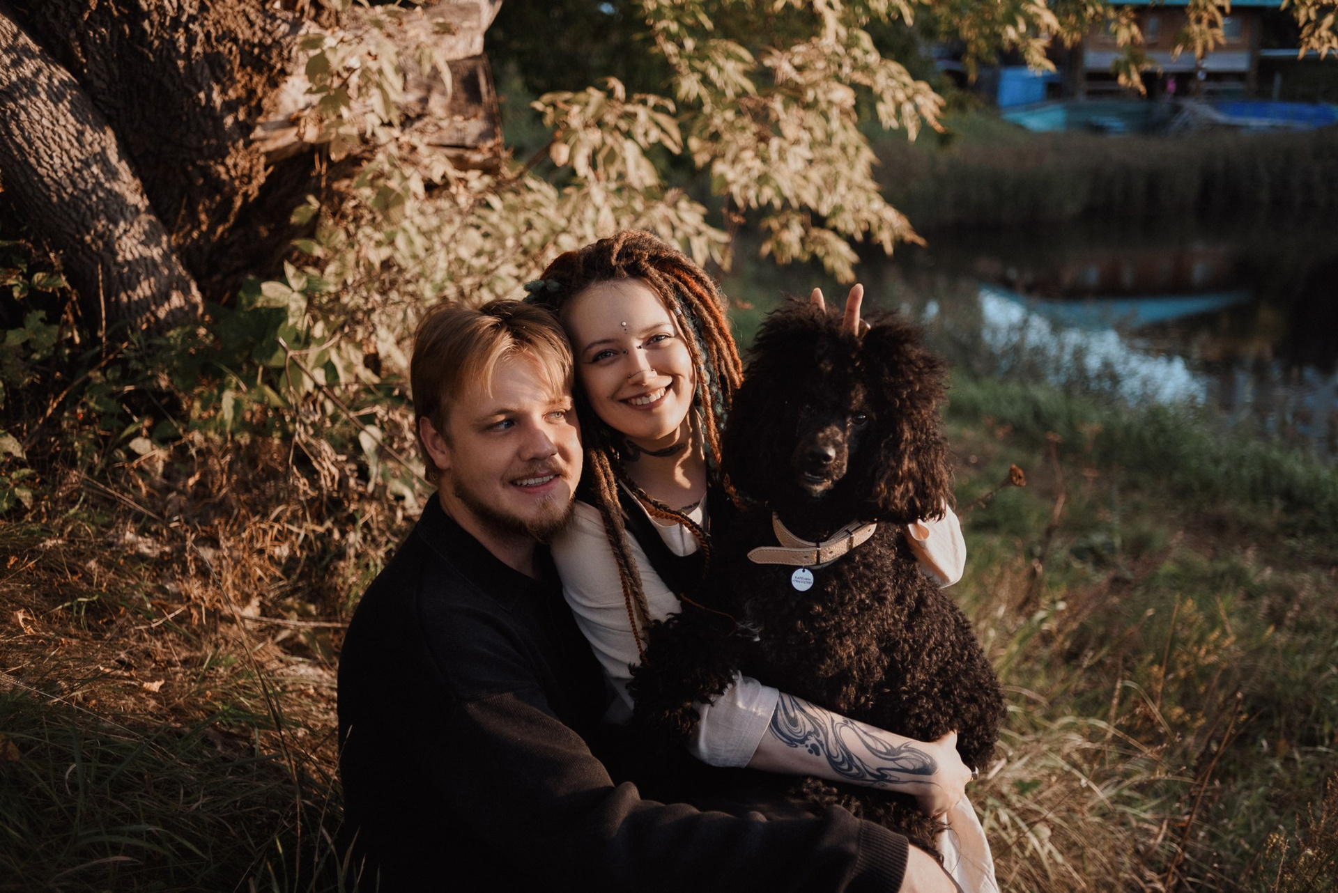 Со Стасей мы знакомы уже пять лет — все это время я доверяю ей свои волосы, а в этот раз она доверила мне самое ценное: историю своей семьи. В кадре Стася, Кирилл и их верный пес Каренин. Символично, что вскоре после этой съемки ребята обручились. Это было идеальное начало их новой главы, продолжение которой можно увидеть в разделе Свадьбы.