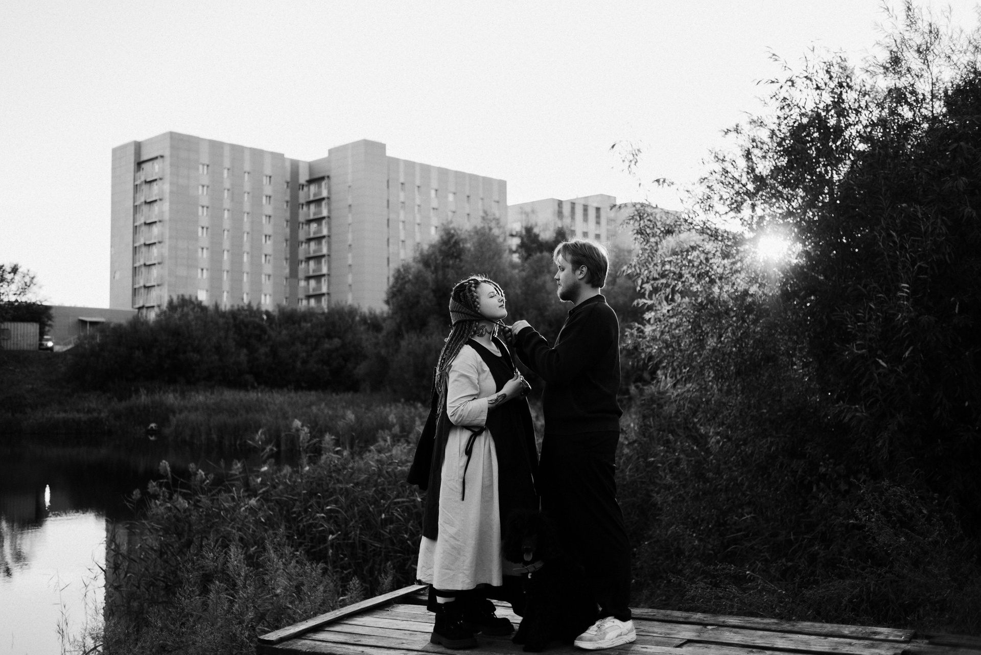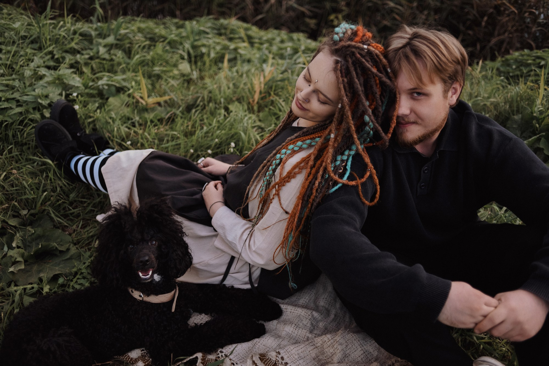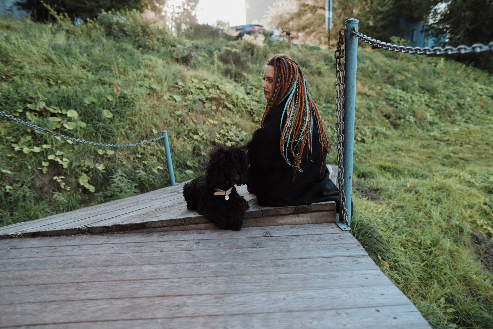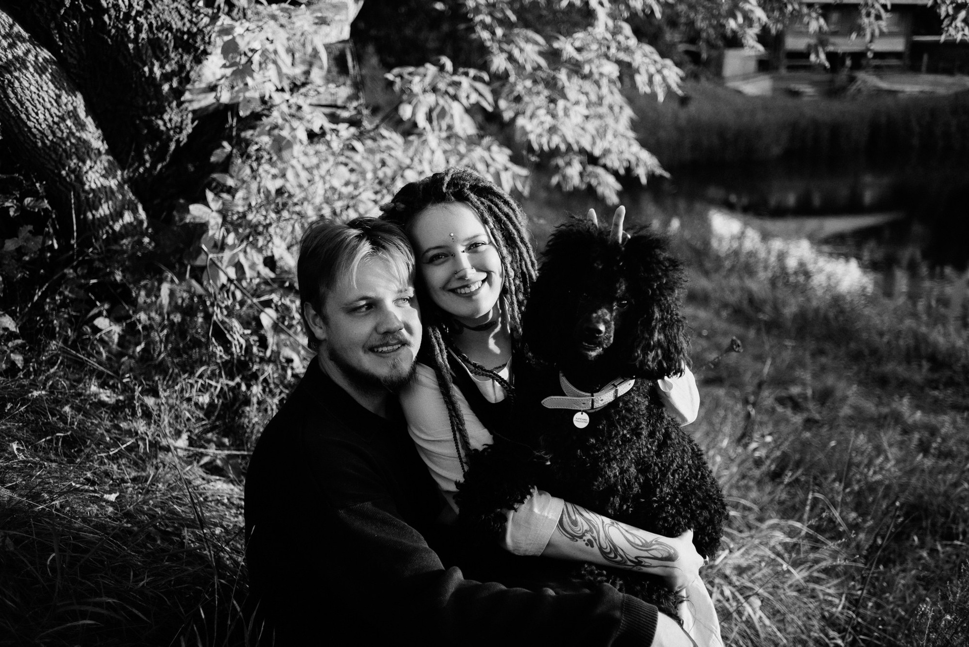 Со Стасей мы знакомы уже пять лет — все это время я доверяю ей свои волосы, а в этот раз она доверила мне самое ценное: историю своей семьи. В кадре Стася, Кирилл и их верный пес Каренин. Символично, что вскоре после этой съемки ребята обручились. Это было идеальное начало их новой главы, продолжение которой можно увидеть в разделе Свадьбы.